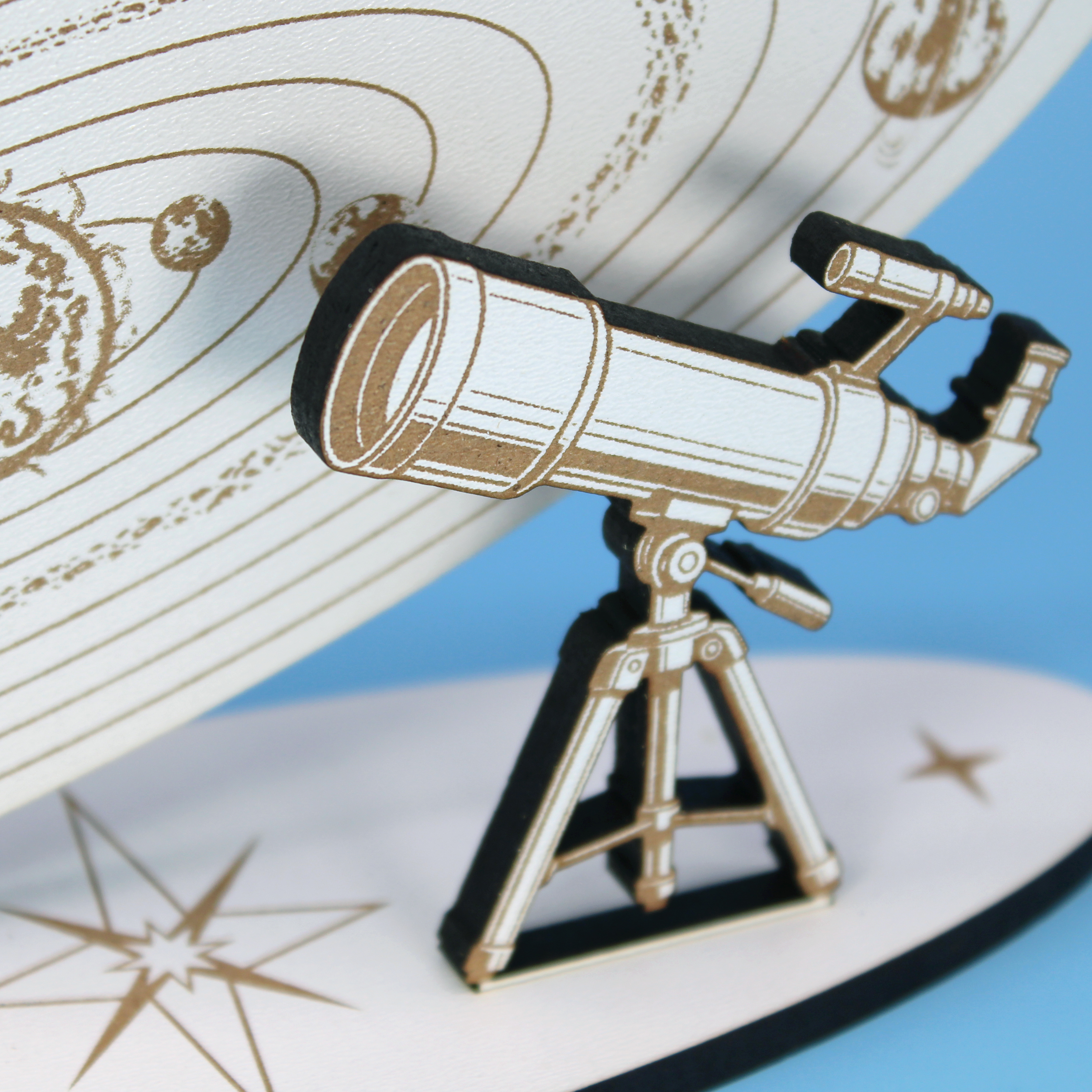 Der Geldgeschenk Sonnensystem Aufsteller ist das ideale Präsent für alle, die Astronomie, Weltraum und Wissenschaft lieben. Der filigran gravierte Aufsteller zeigt unser Sonnensystem mit Planeten, Umlaufbahnen und einem Teleskop – perfekt für Weltraum-Fans, Hobby-Astronomen und Technikbegeisterte. Die braune Lasergravur auf weißem HDF erzeugt einen modernen, klaren Look mit hohem Kontrast.