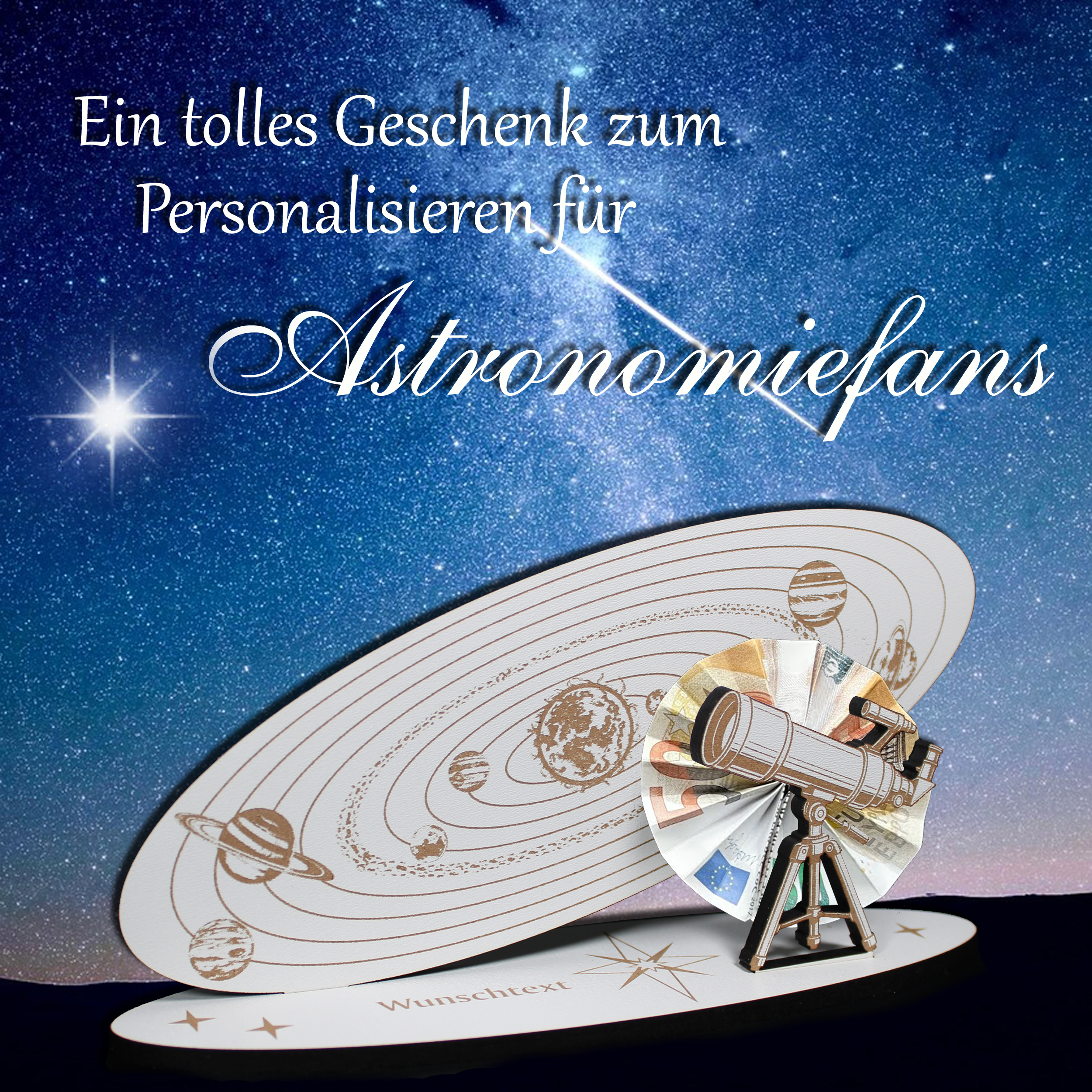 Geldgeschenk Sonnensystem – Deko Aufsteller 20x10 cm mit brauner Gravur, Teleskop & personalisierbarem Sockel – Geschenkidee für Astronomie, Weltraum & Wissenschaft