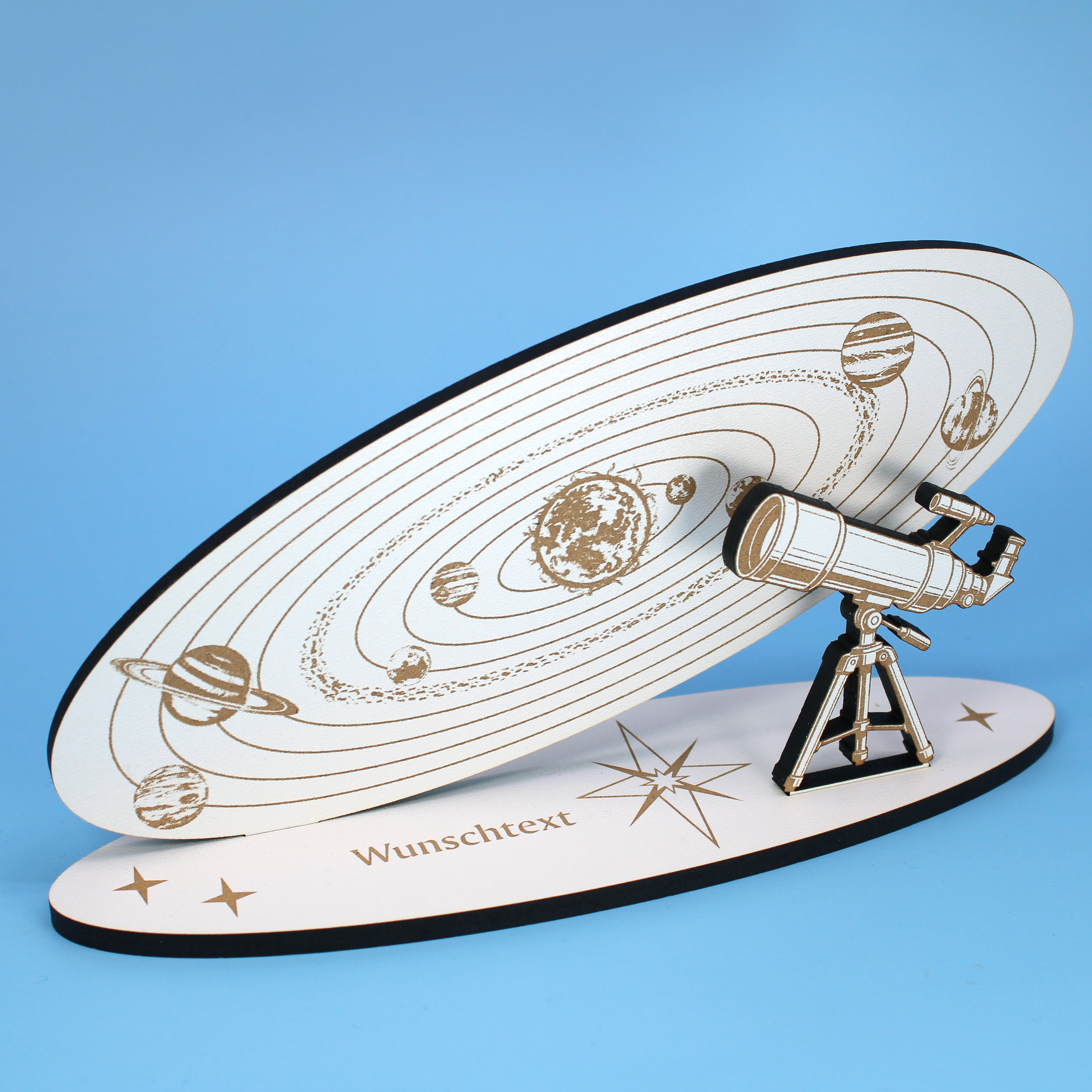 - Geldgeschenk Sonnensystem Aufsteller – Weißes HDF 20x10 cm mit feiner Lasergravur von Planeten, Teleskop und personalisierbarem Fuß – perfekte Geschenkidee für Astronomie- und Raumfahrt-Fans.