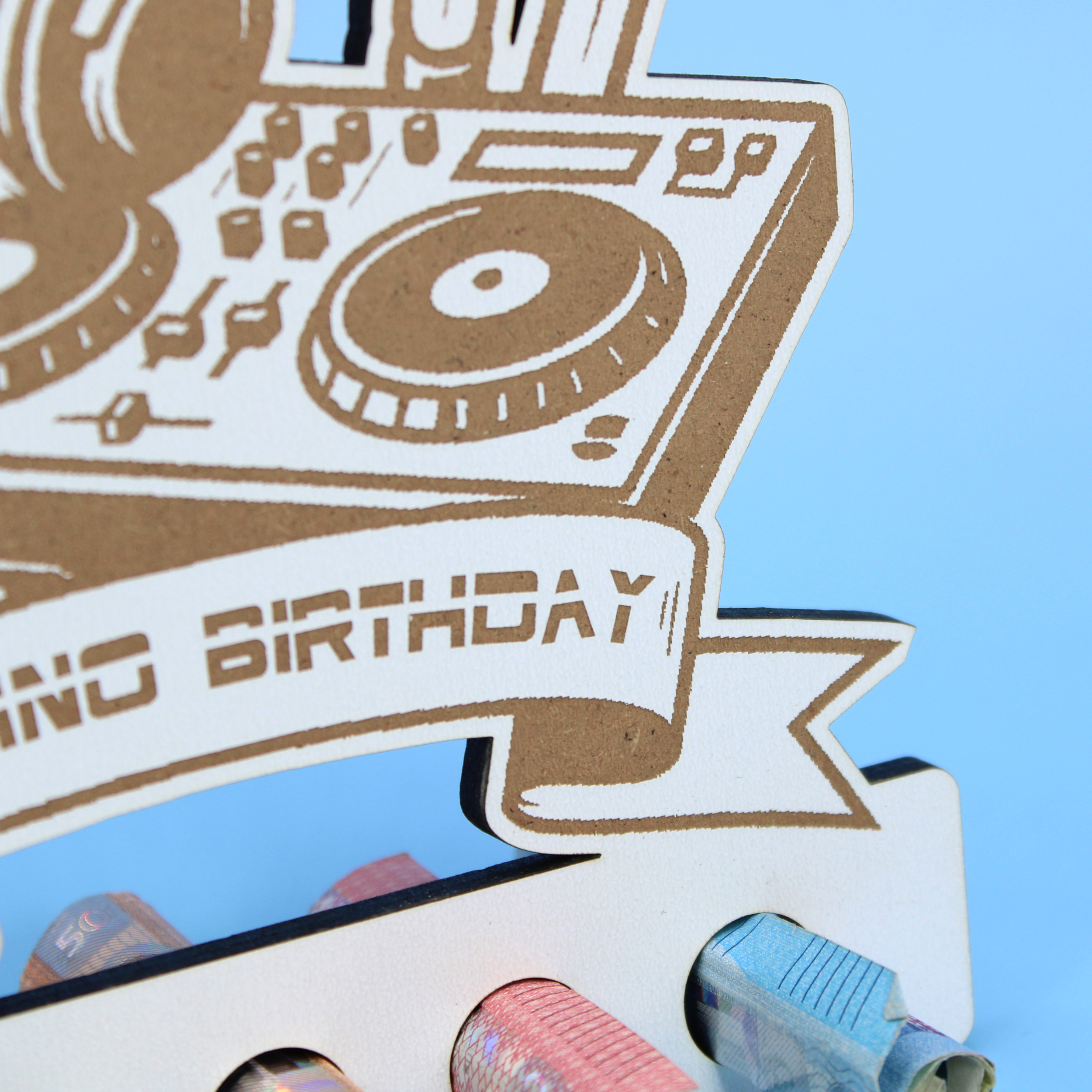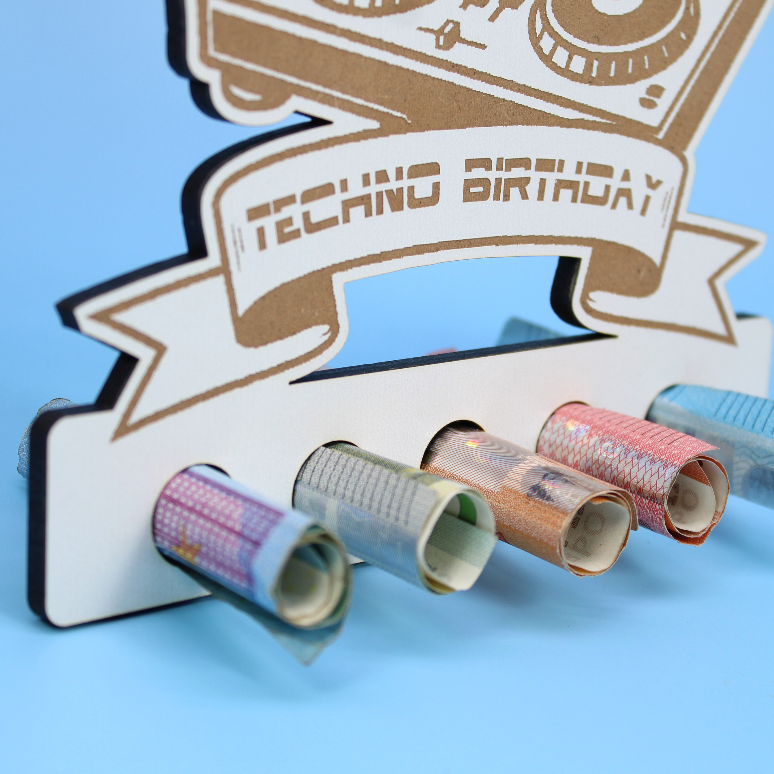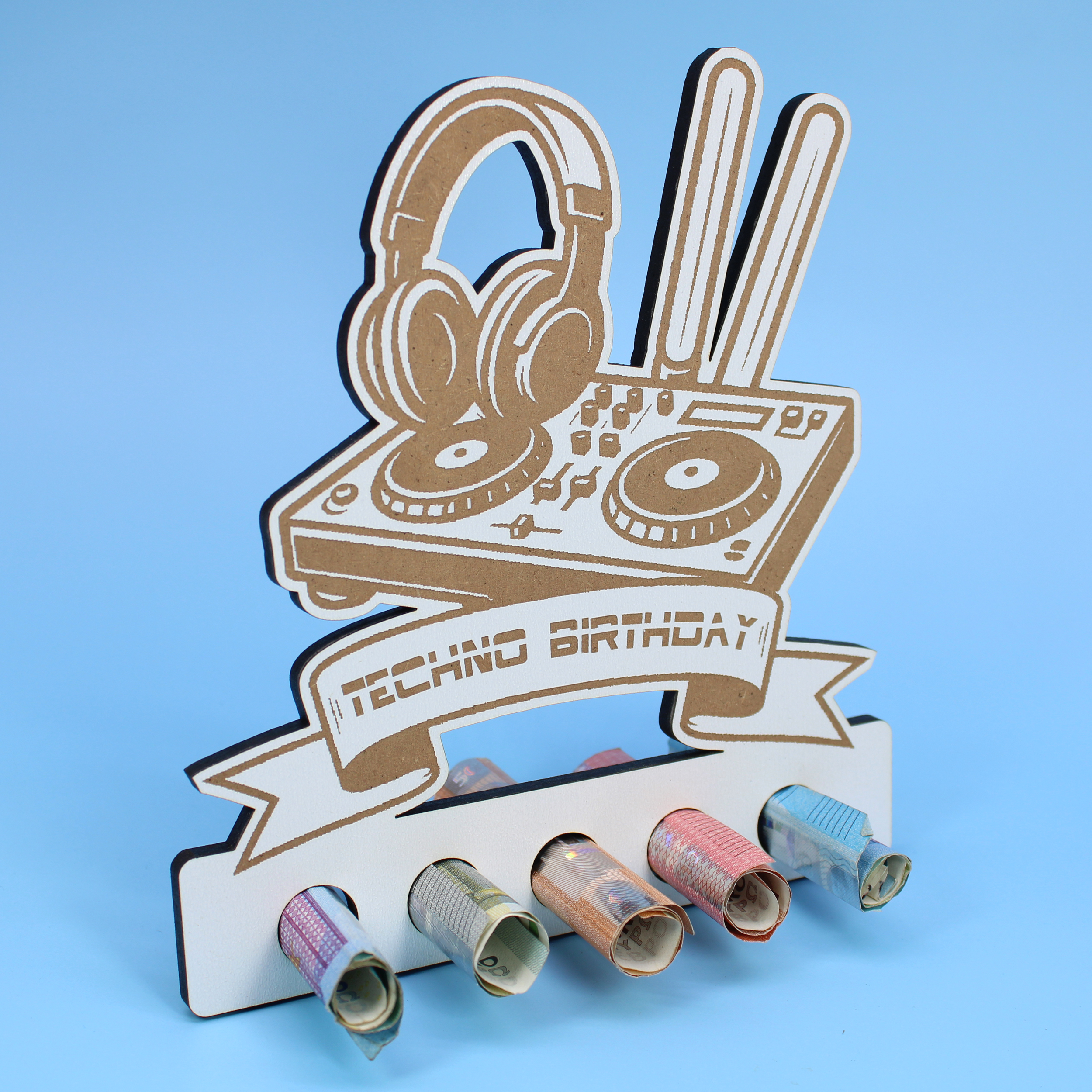Das Geldgeschenk Techno Birthday ist das perfekte Highlight für alle Fans der elektronischen Musikszene. Es zeigt ein modernes DJ-Pult, stylische Kopfhörer und markante Neonröhren – detailreich graviert in weißes HDF mit kontrastreicher brauner Lasergravur. Der Schriftzug Techno Birthday verleiht dem Geschenk den passenden elektronischen Spirit für technobegeisterte Geburtstagskinder.