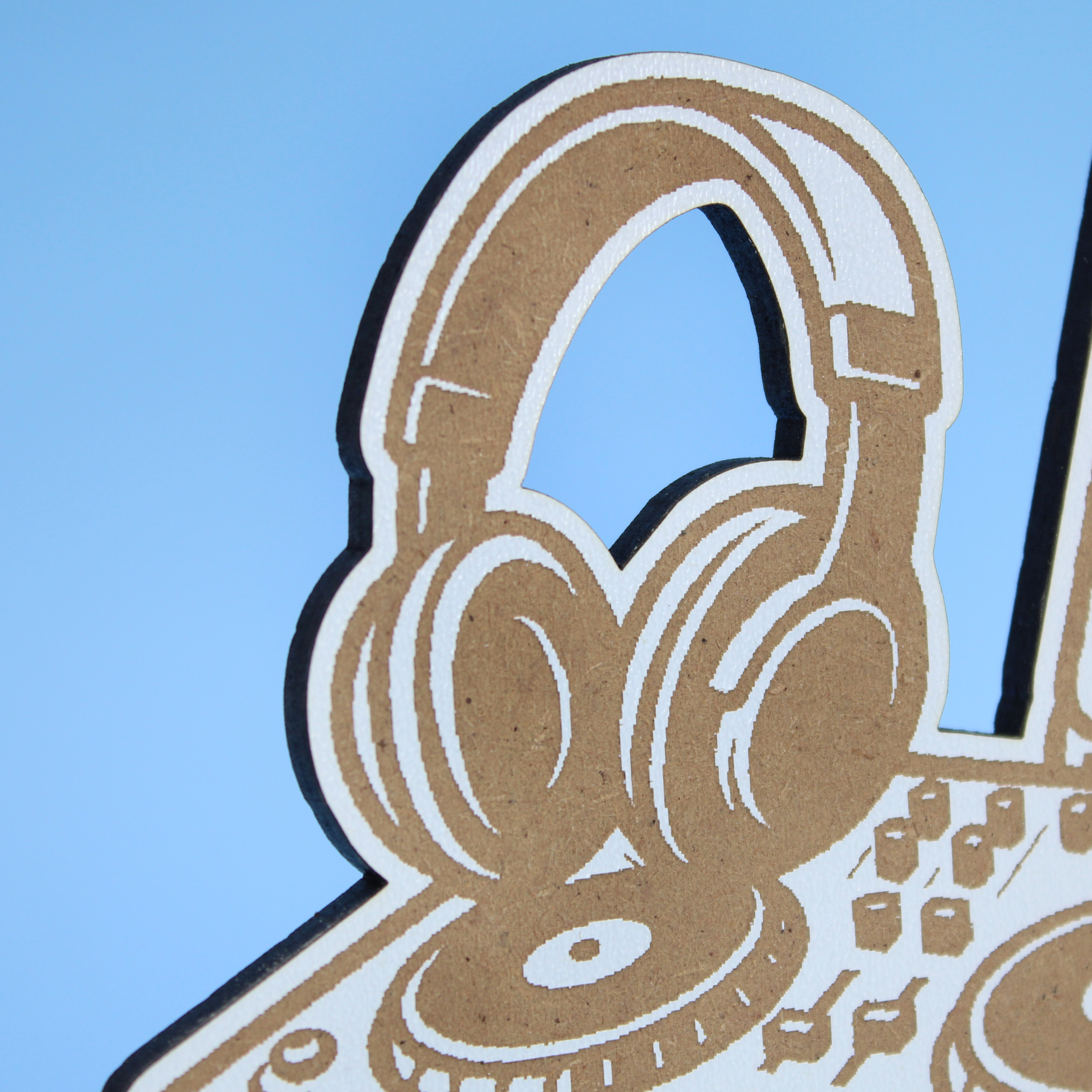 - Hochwertige Verarbeitung – Weißes HDF mit brauner Lasergravur, klare Linien und moderner Techno-Look – dekoratives Highlight fürs Wohnzimmer, Musikstudio oder DJ-Pult.