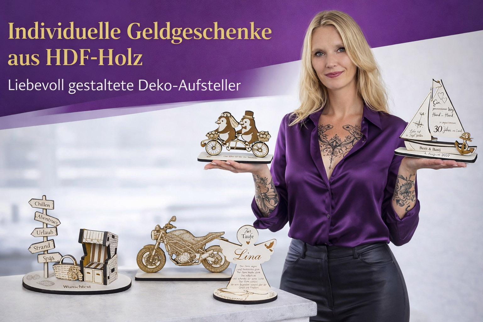 Unsere liebevoll gestalteten Geldgeschenke aus weißem HDF-Holz sind mehr als nur eine originelle Verpackung für Geld – sie sind bleibende Erinnerungsstücke mit persönlichem Charakter. Jedes Motiv wird mit viel Sorgfalt entworfen und präzise gefertigt, sodass hochwertige, dekorative Aufsteller entstehen, die perfekt zu den verschiedensten Anlässen passen.