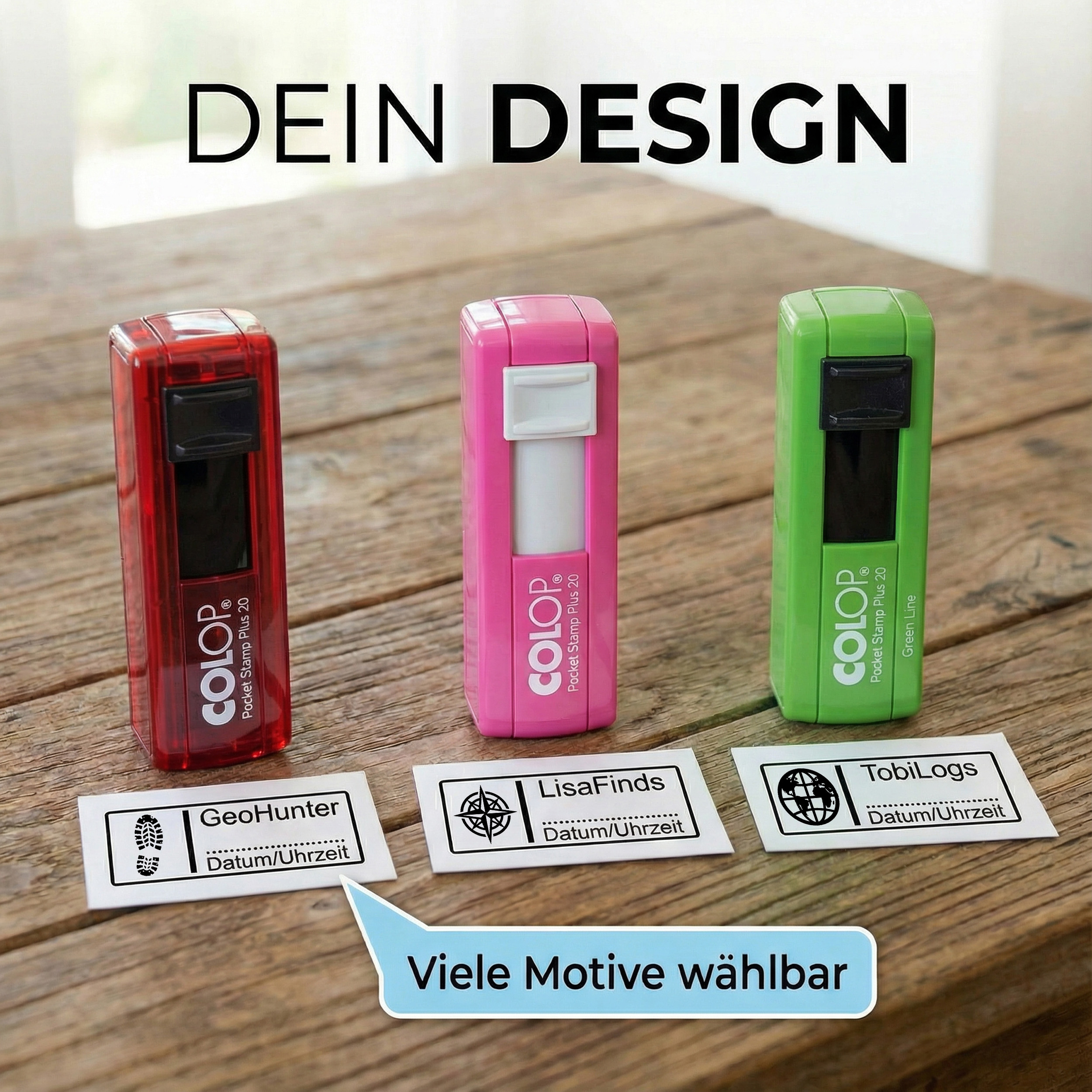 - Personalisierter Stempel selber machen – personalisiert mit Nickname oder Text, individuell gestalten als personalisierter Cachingstempel; perfekt für dein Geocaching Logbuch, damit jeder Fund eindeutig dir zugeordnet ist.