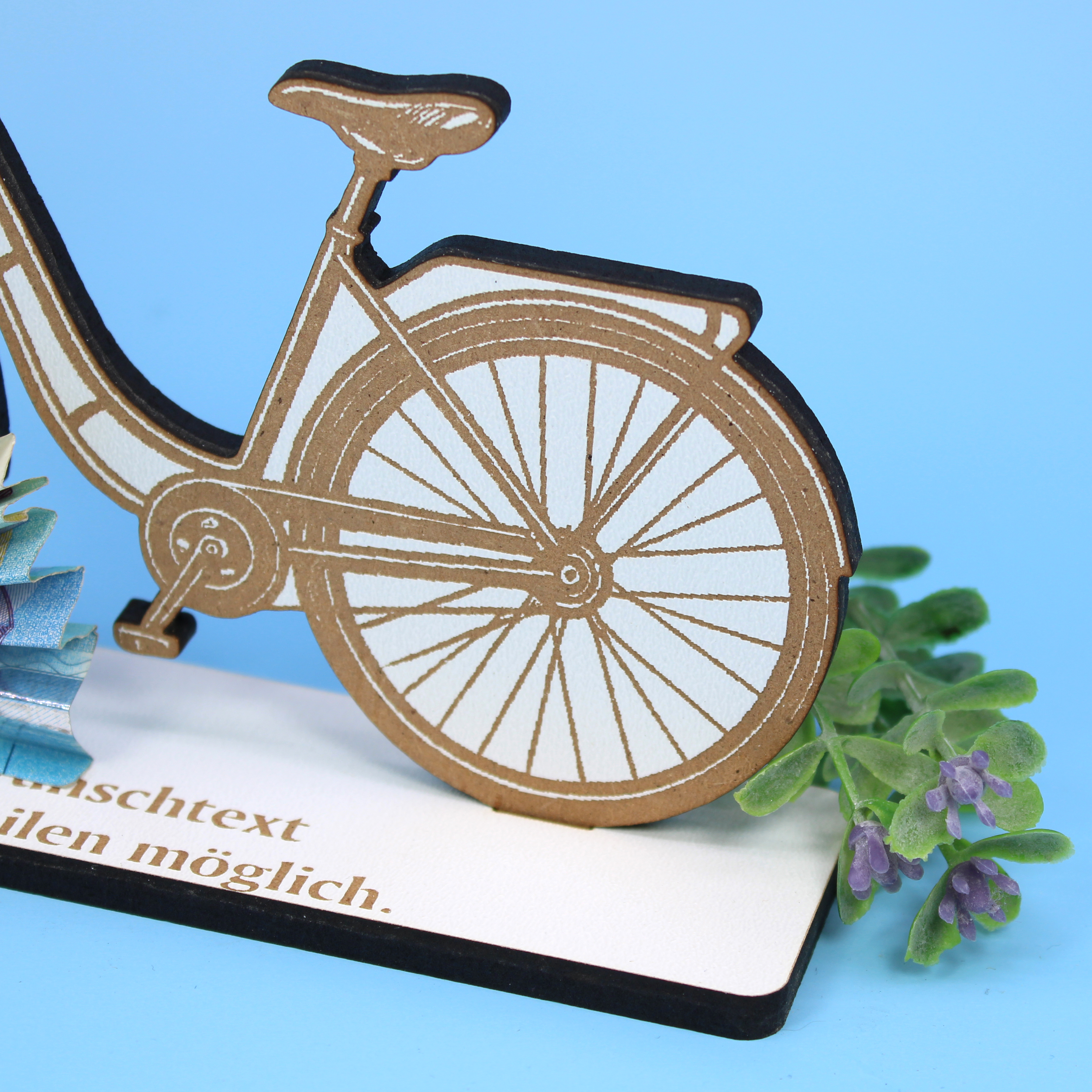 Der Aufsteller Damenrad Stadtfahrrad Damen Fahrrad ist das perfekte Geschenk für alle Fahrradliebhaber und Radfahrerinnen. Das moderne Design zeigt ein stilisiertes Fahrrad mit passendem Schild, das gemeinsam auf einem stabilen Sockel steht. Sowohl der Sockel als auch das Schild sind personalisierbar – ideal für Namen, Daten oder kurze Sprüche, die den Aufsteller zu einem individuellen Unikat machen.