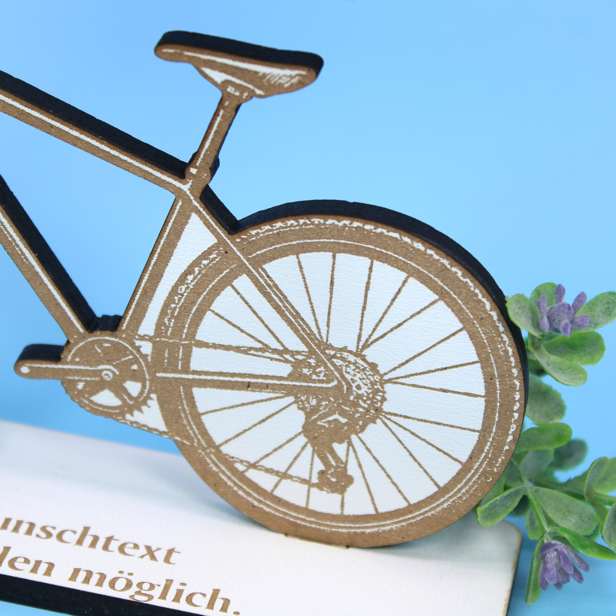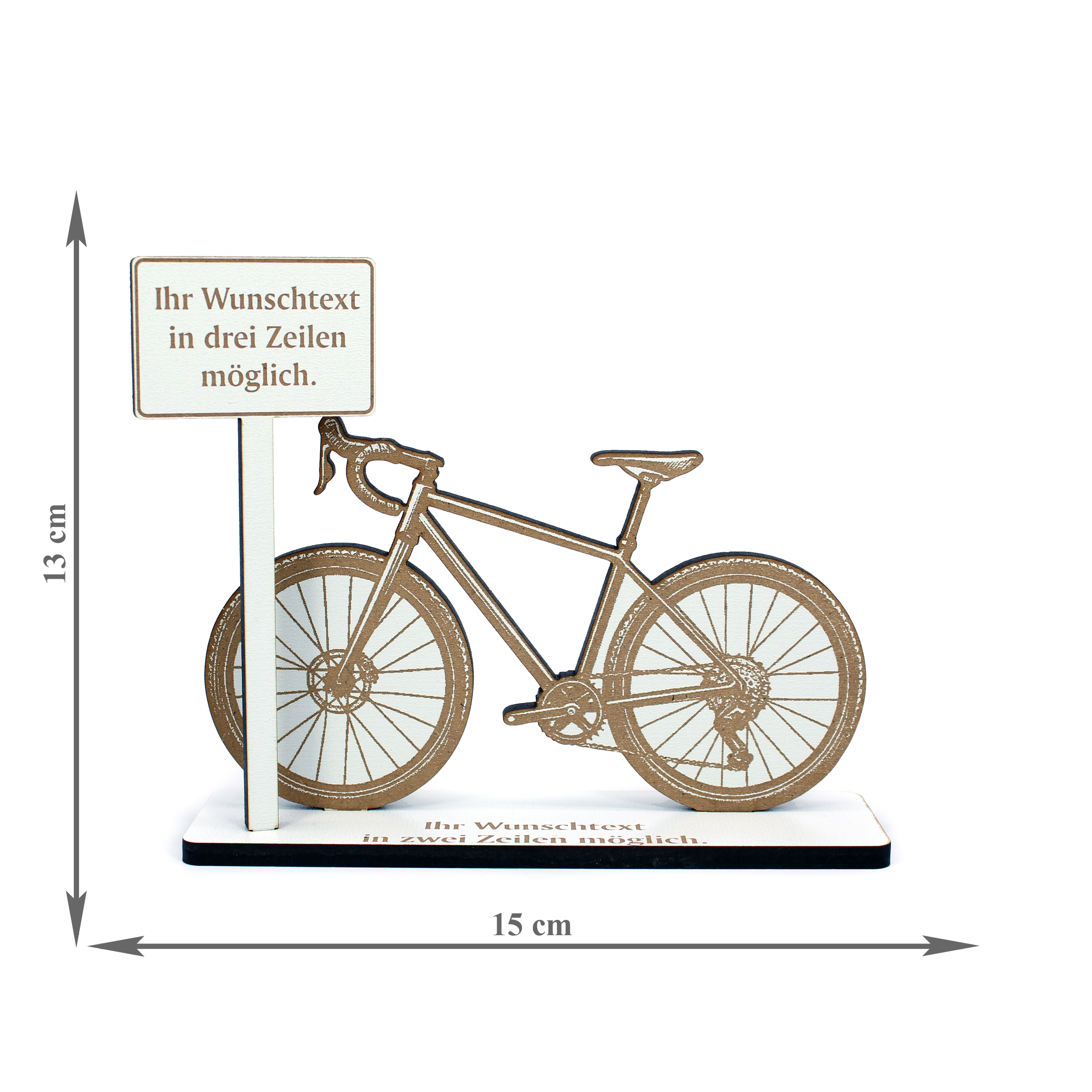 Gefertigt aus 5 mm starkem HDF überzeugt der Aufsteller durch seine hohe Stabilität und die präzise Lasergravur in edlem Braun auf weißer Oberfläche. Die schwarze Schnittkante sorgt für einen modernen Kontrast und eine saubere Optik. Mit seinen Maßen von 15 cm Länge und 13 cm Höhe ist der Fahrradaufsteller ein dekoratives Element, das in jedem Raum einen Akzent setzt – ob im Wohnzimmer, Büro, Flur oder als Geschenkidee für Fahrradfans.