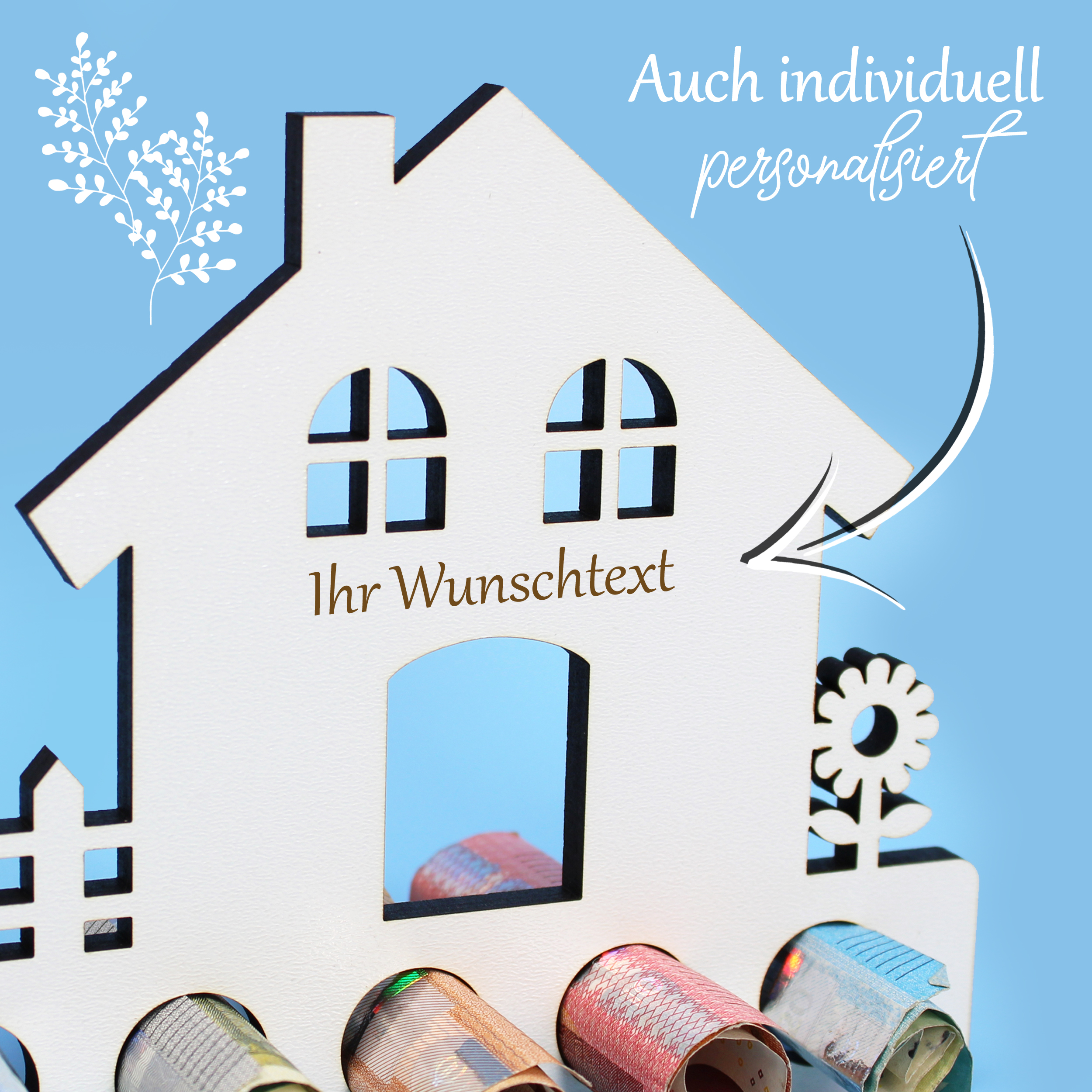 Auf Wunsch kann das Geldgeschenk gegen Aufpreis mit einem individuellen Wunschtext graviert werden – etwa mit Namen, Datum oder kurzer Botschaft. Damit wird dieses Einweihungsgeschenk zu einem einzigartigen Erinnerungsstück an den besonderen Moment des Hauskaufs oder der Hauseinweihung.