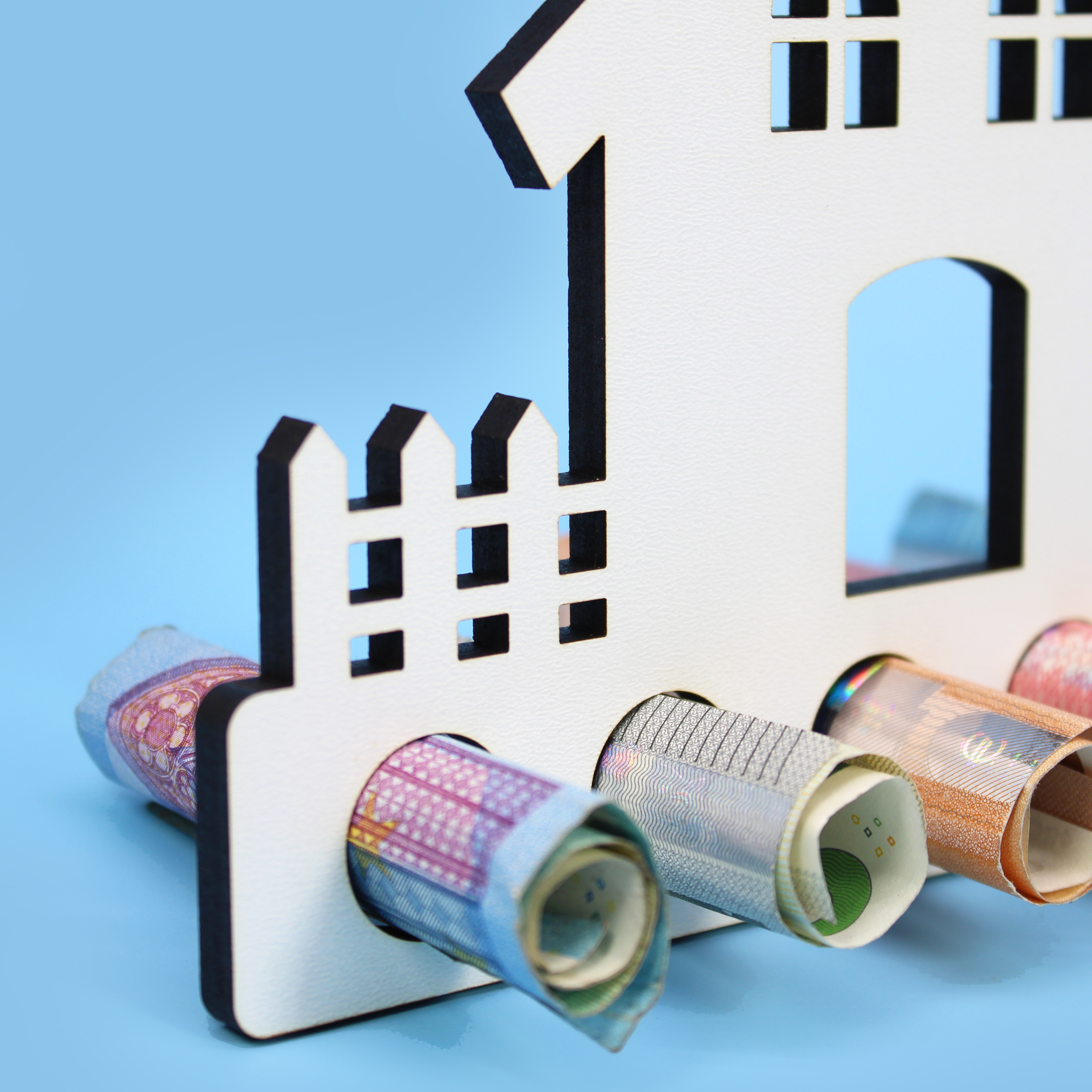 Das Geldgeschenk verfügt über fünf runde Öffnungen, in die Geldscheine eingerollt und dekorativ eingesetzt werden können. So wird aus einem einfachen Geschenk ein stilvoller Wunscherfüller für den Start ins neue Heim. Perfekt geeignet für den Einzug in eine Wohnung, den Hausbau, die erste gemeinsame Wohnung oder das Richtfest.
