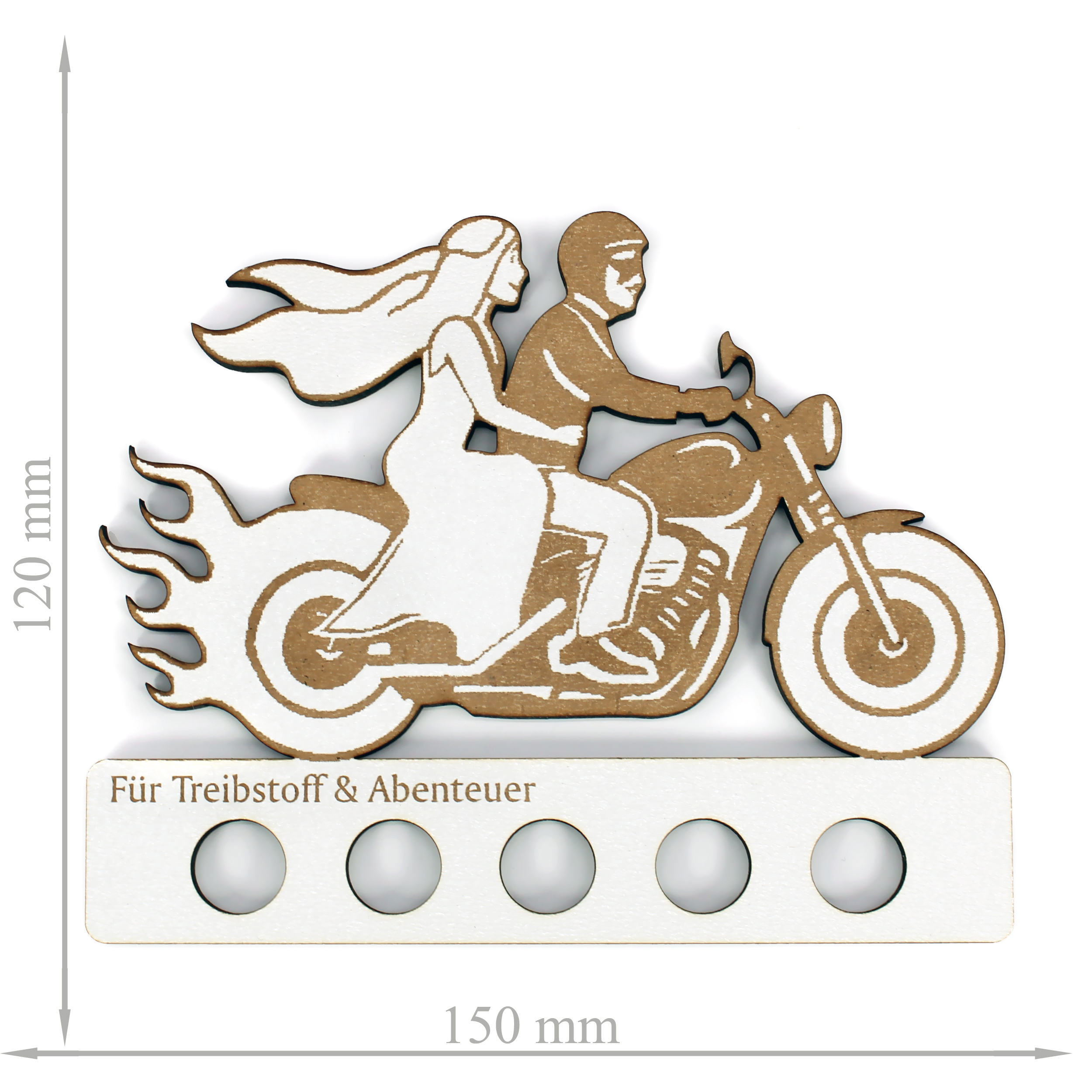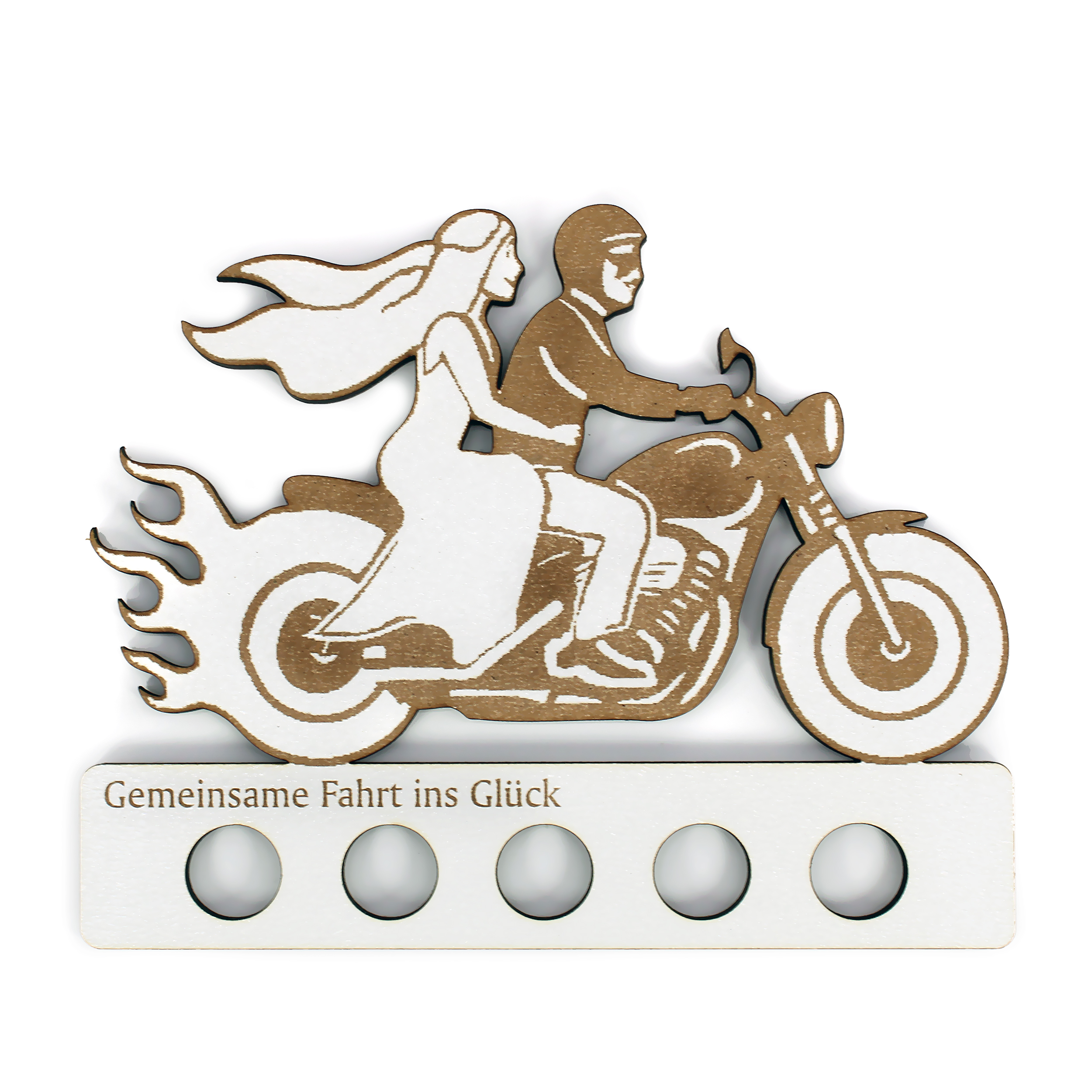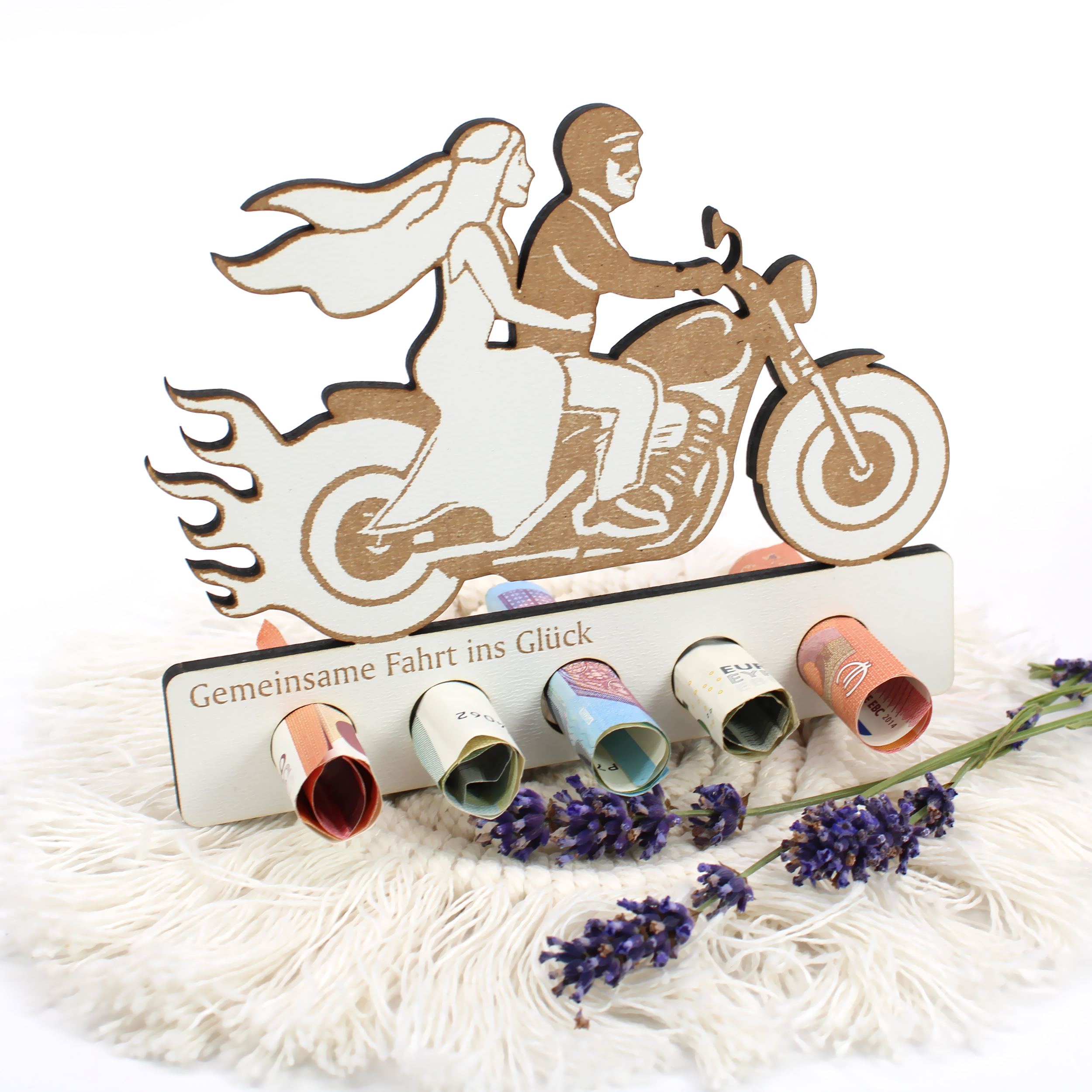 Dieses Geldgeschenk ist wie gemacht für Biker, Rocker und Motorradliebhaber: Das Brautpaar auf dem Motorrad ist nicht nur ein Statement, sondern auch ein echter Hingucker. Das liebevoll gravierte Schild aus stabilem HDF (155 x 150 mm) bietet 5 Aussparungen für gerollte Geldscheine – die perfekte Verbindung aus Humor, Stil und Herz.