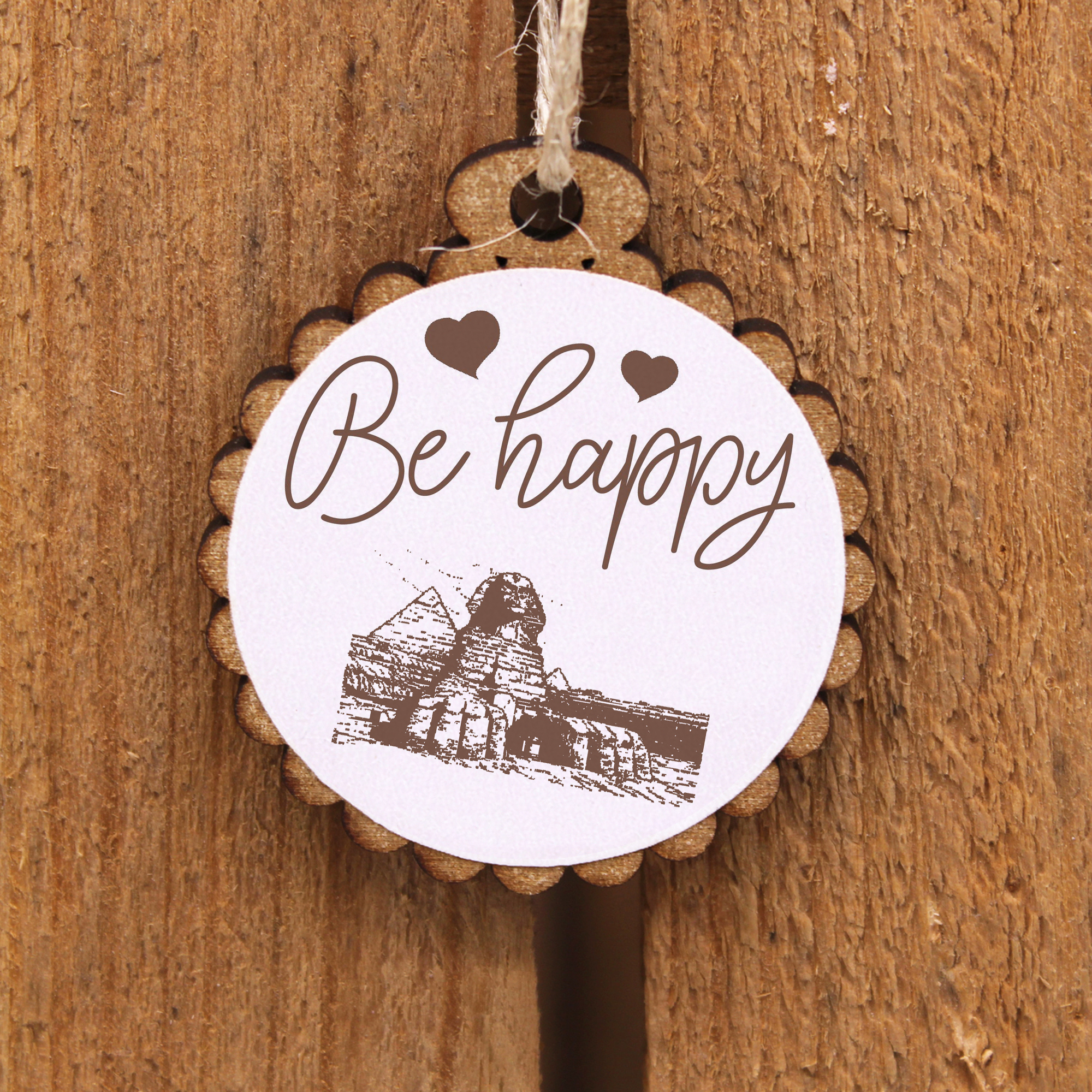 Produktinformationen "Geschenkanhänger - Be Happy Große Sphinx von Gizeh - Holz Ø-5cm - mit Juteband"