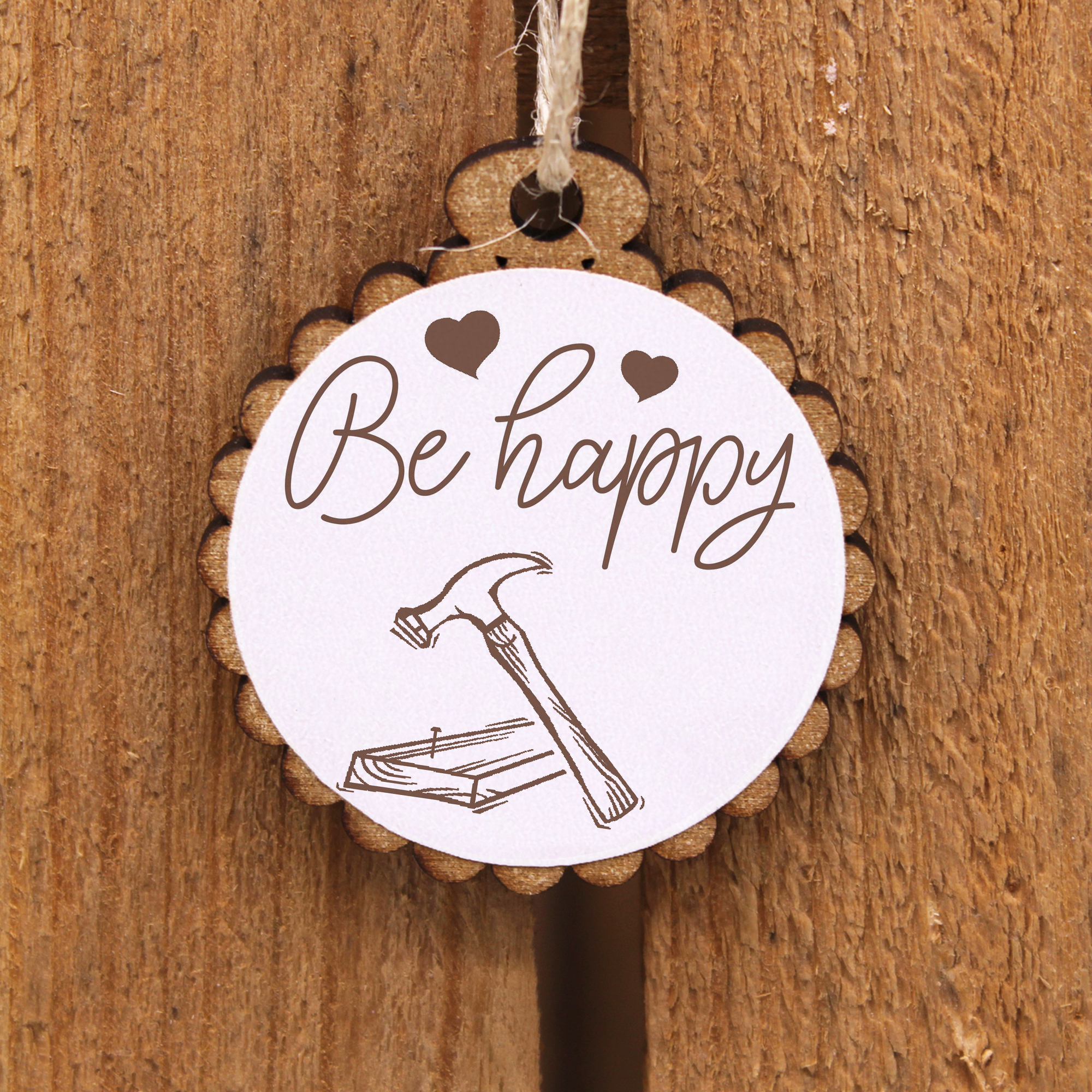 Geschenkanhänger - Be Happy Hammer und Brett - Holz Ø-5cm - mit Juteband