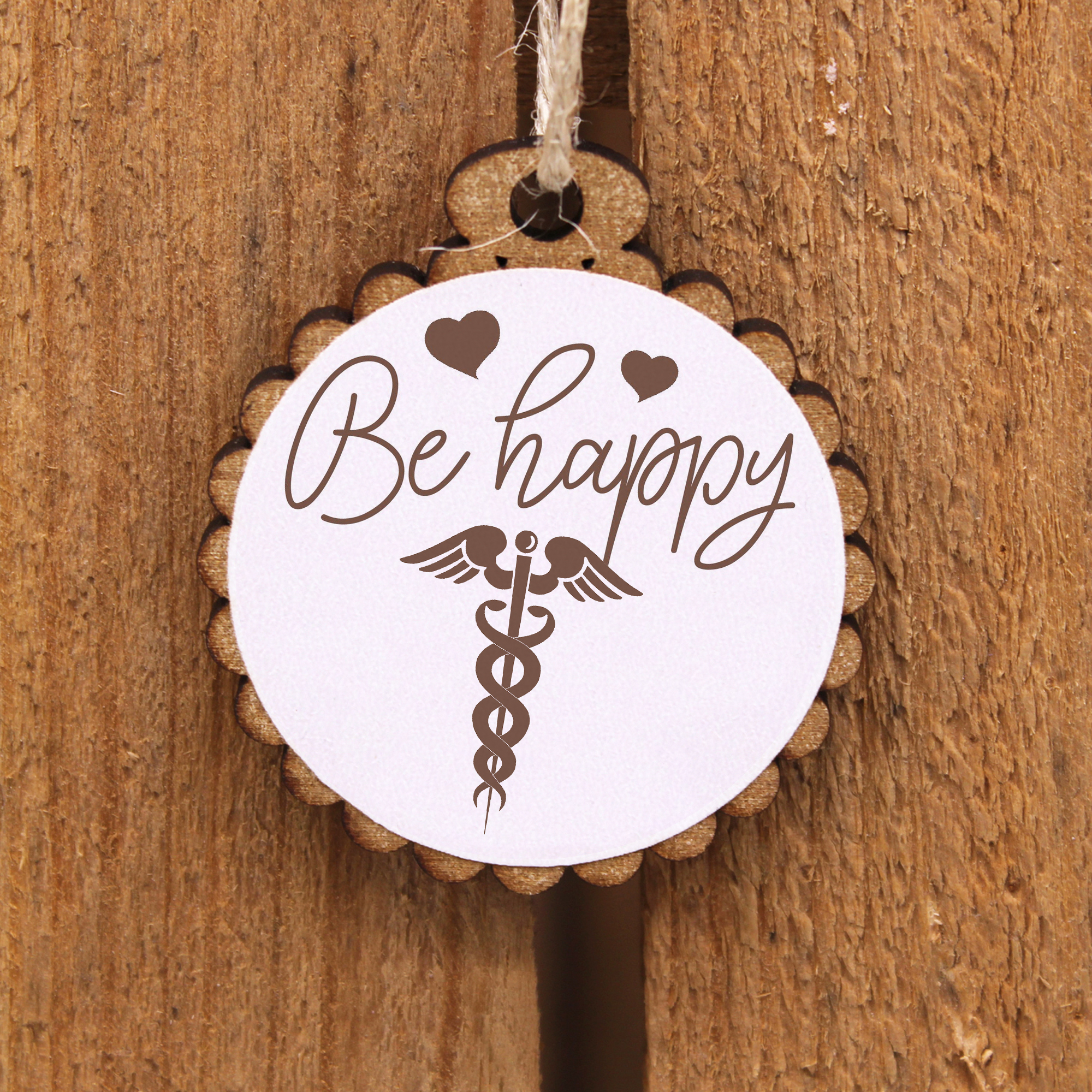 Geschenkanhänger - Be Happy Hermesstab - Holz Ø-5cm - mit Juteband