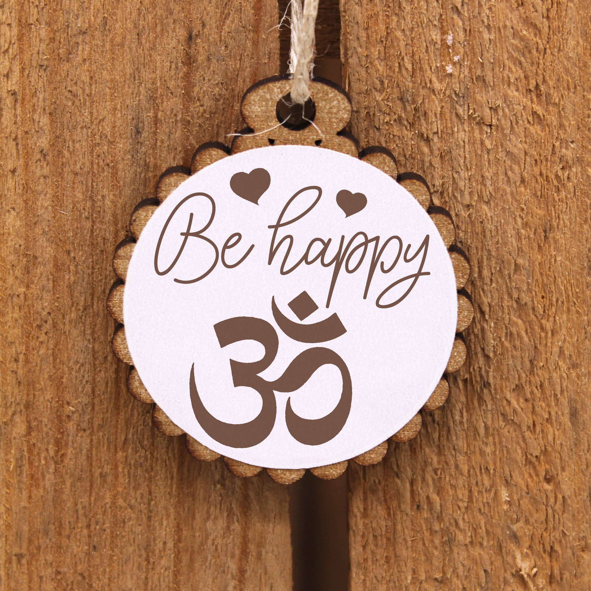Geschenkanhänger - Be Happy Hinduismus - Holz Ø-5cm - mit Juteband