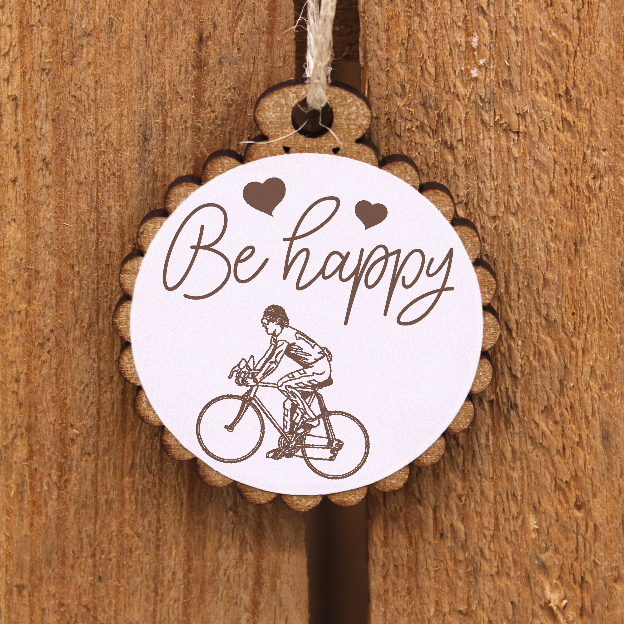 Geschenkanhänger - Be Happy Radfahrer - Holz Ø-5cm - mit Juteband