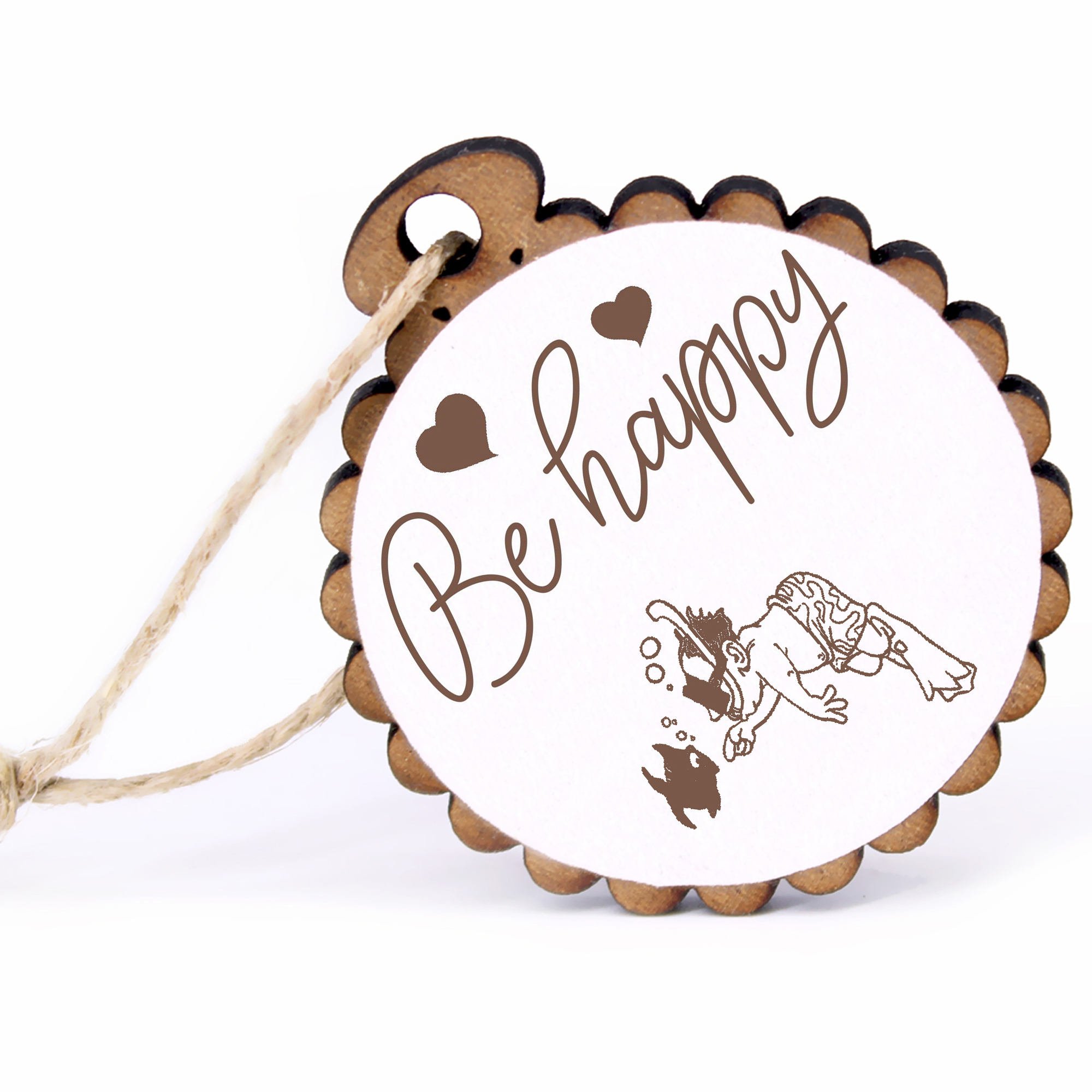 Geschenkanhänger - Be Happy Schnorcheln mit Fisch - Holz Ø-5cm - mit Juteband