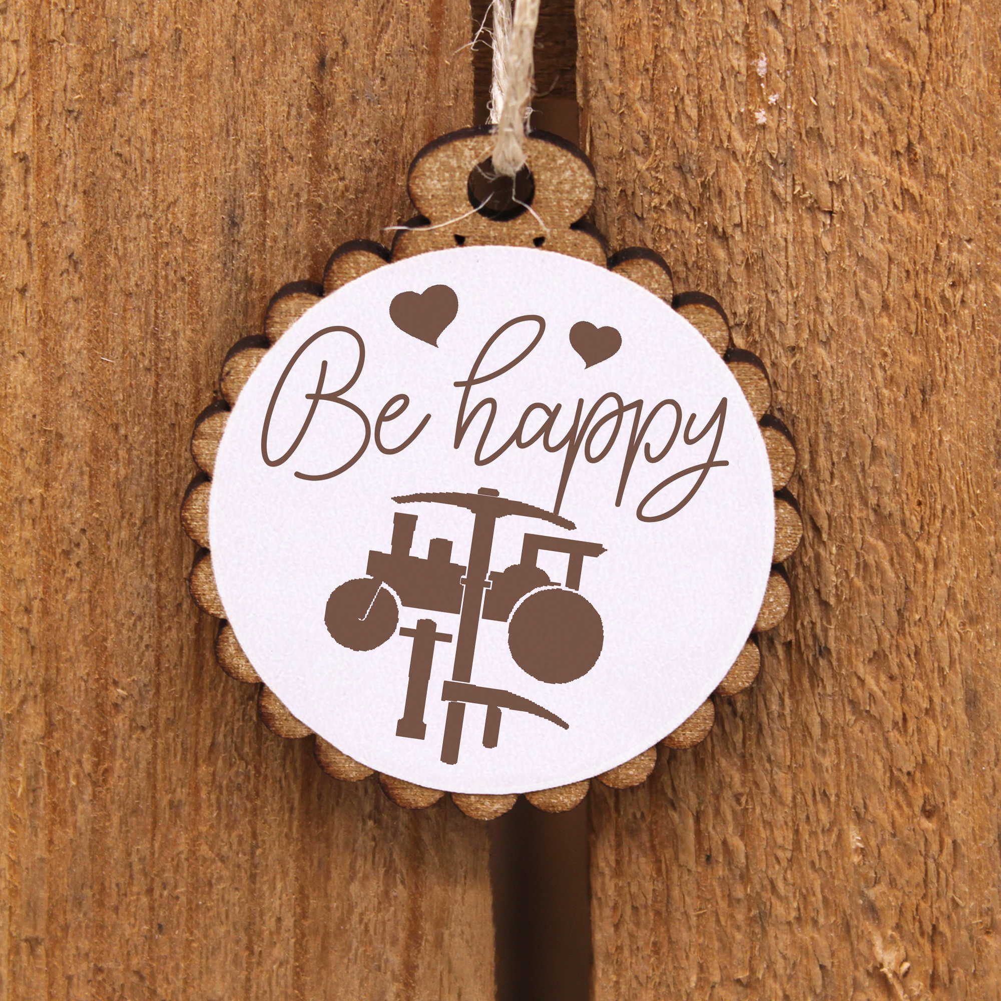 Geschenkanhänger - Be Happy Straßenbau - Holz Ø-5cm - mit Juteband