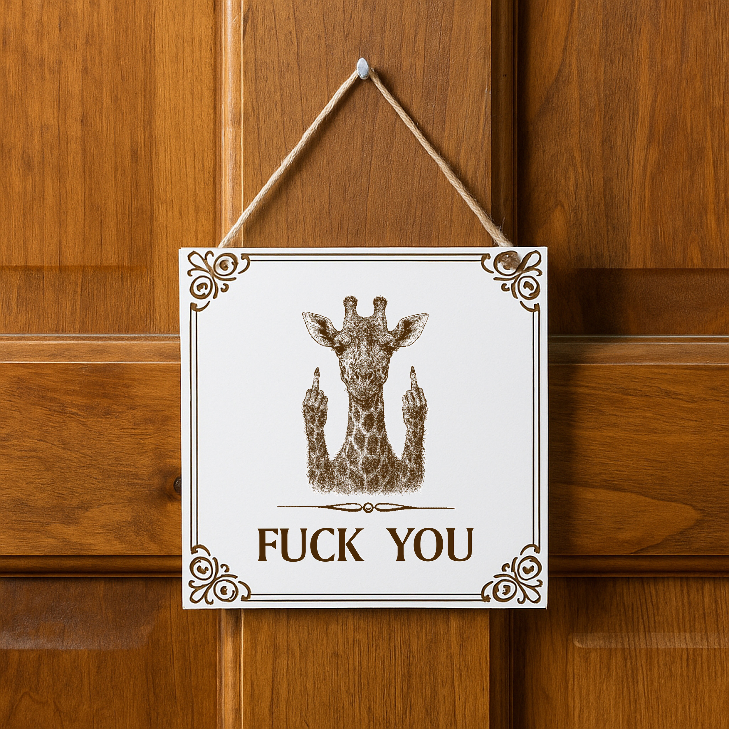 Dieses weiße HDF-Schild bringt Humor und Provokation in deine Wohnung: Eine lustige Giraffe mit ausgestrecktem Stinkefinger und der Gravur „Fuck You“. Das Motiv ist