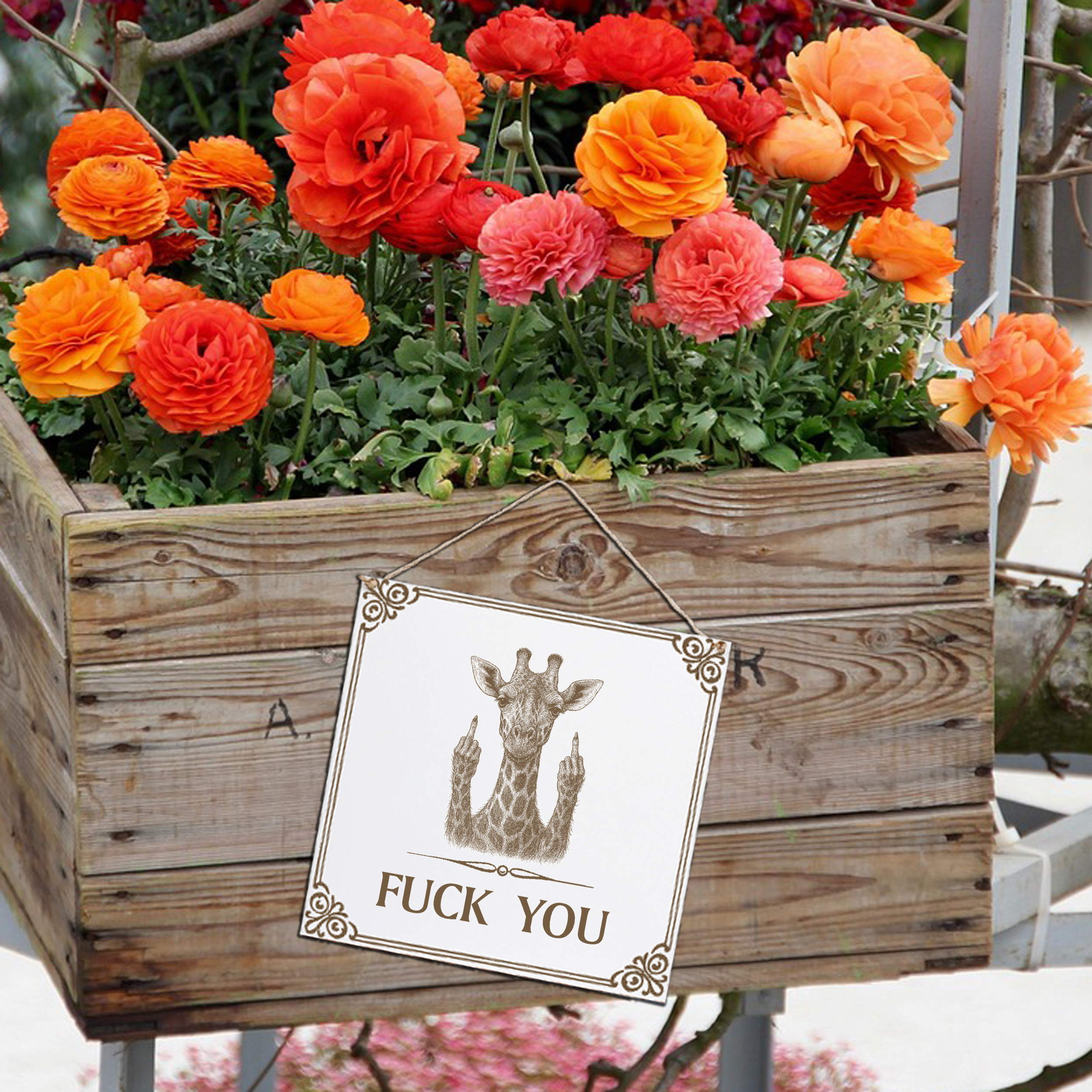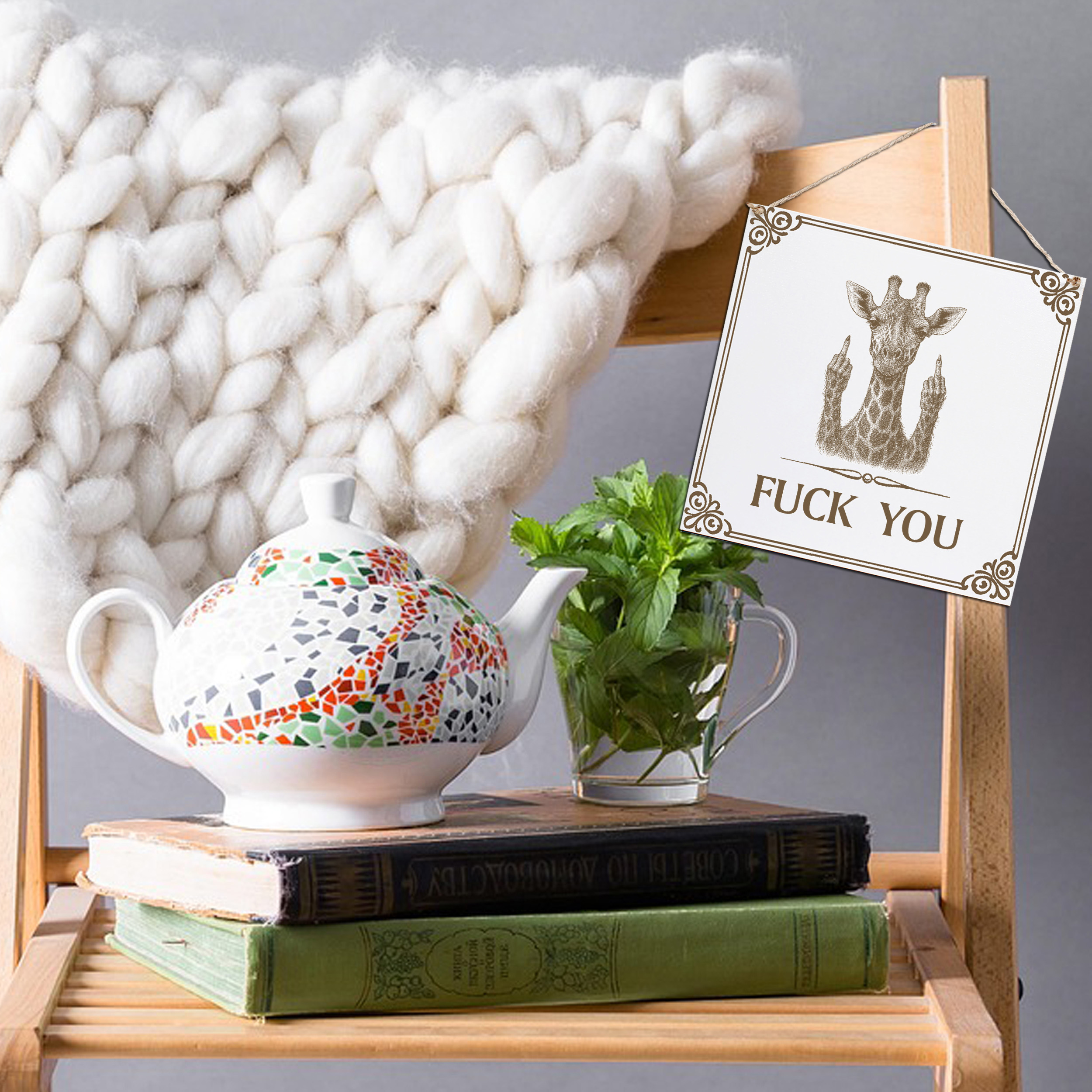 Giraffe Wandschild „Fuck You“ – Weißes HDF-Dekoschild 15×15 cm (auch 20×20 cm)
