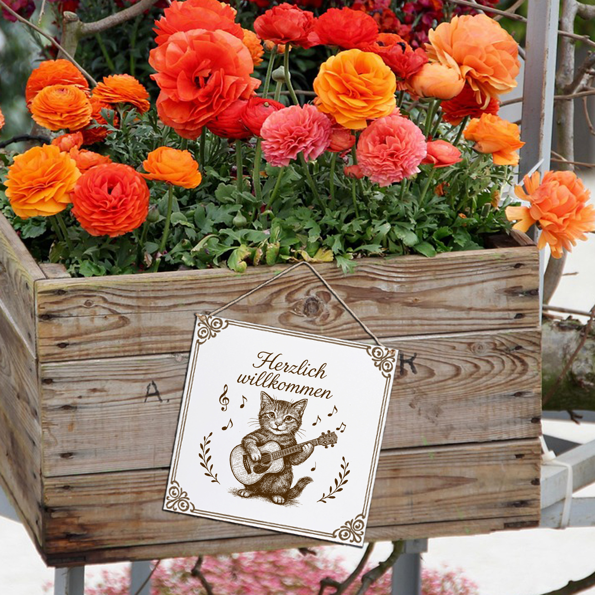 Herzlich Willkommen Katze mit Gitarre Schild 15×15 cm – Weißes HDF Türschild mit Gravur