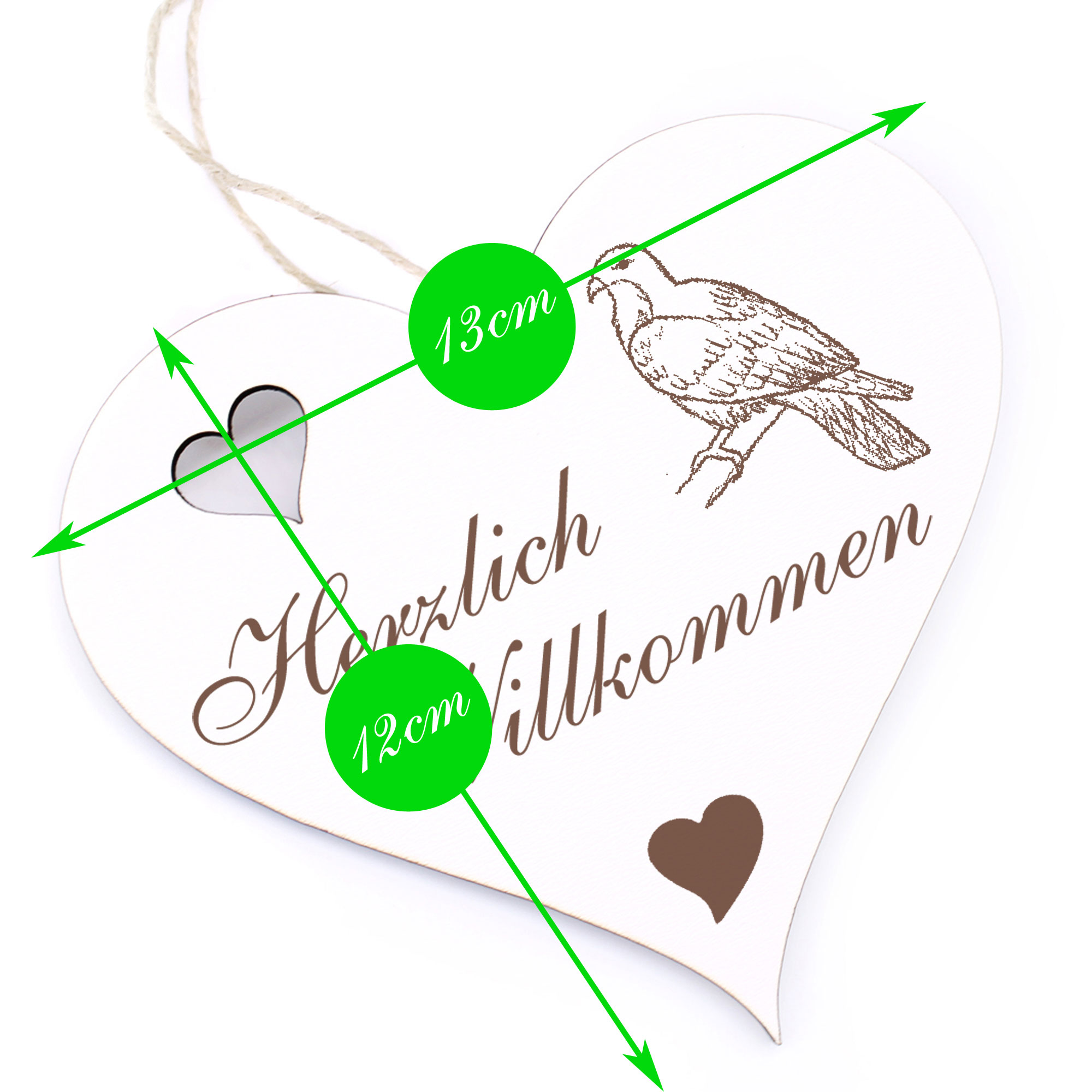 - DETAILS: Das Herzlich Willkommen Herz ist aus Holz (HDF) gefertigt, ist ca. 13cm x 12cm groß und wiegt etwa 41g. Das Juteband zum Aufhängen ist bereits an Ihrem Türschmuck angeknotet. Sie brauchen es nur noch an den Hauseingang bzw. an die Eingangstür hängen