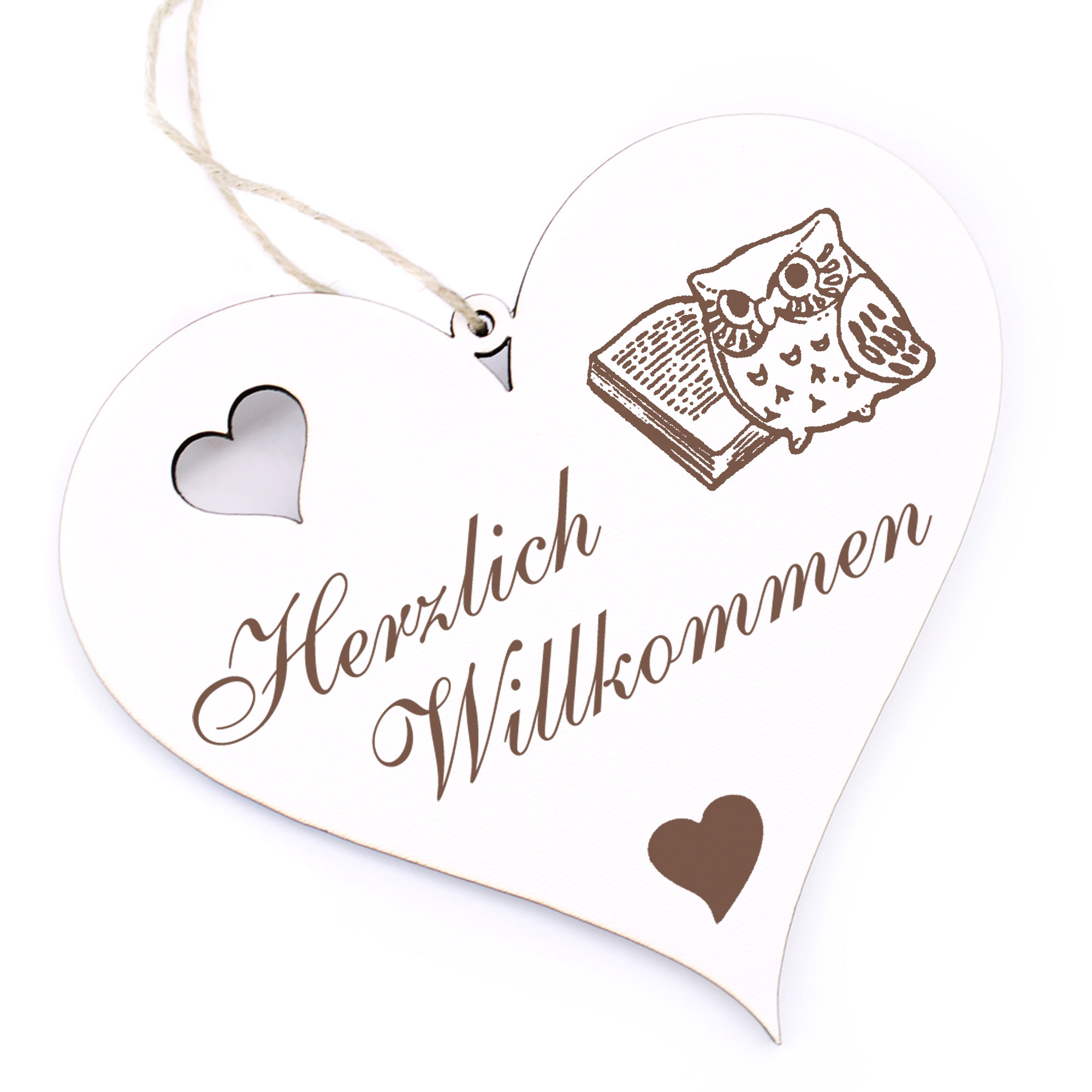 Herzlich Willkommen Schild - Eule und Buch - Deko Herz Holz