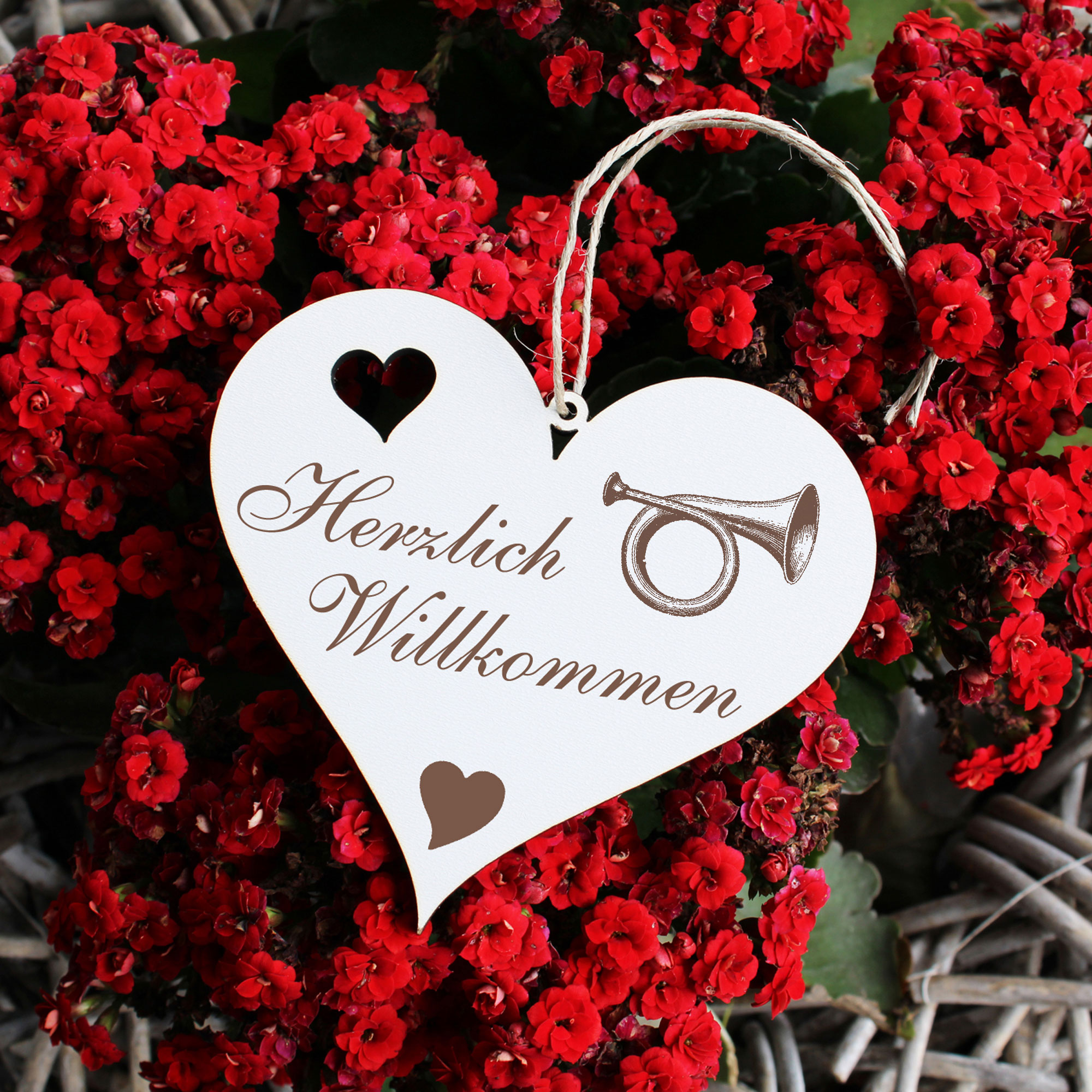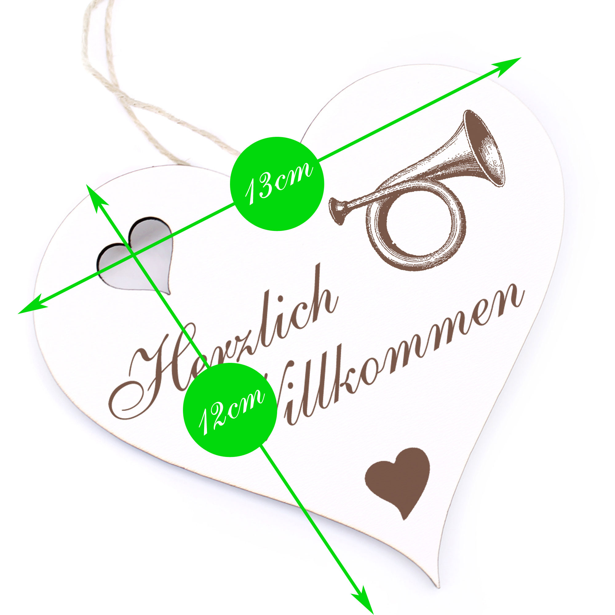 - DETAILS: Das Herzlich Willkommen Herz ist aus Holz (HDF) gefertigt, ist ca. 13cm x 12cm groß und wiegt etwa 41g. Das Juteband zum Aufhängen ist bereits an Ihrem Türschmuck angeknotet. Sie brauchen es nur noch an den Hauseingang bzw. an die Eingangstür hängen