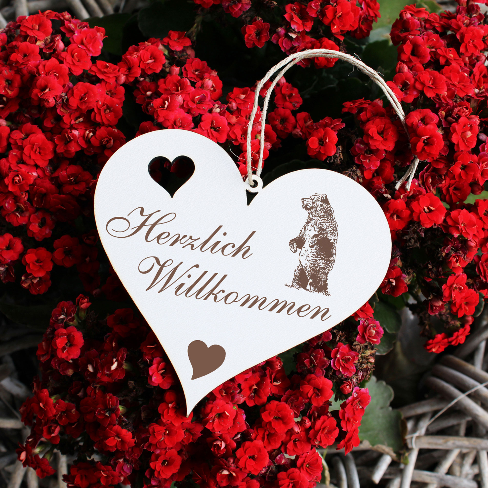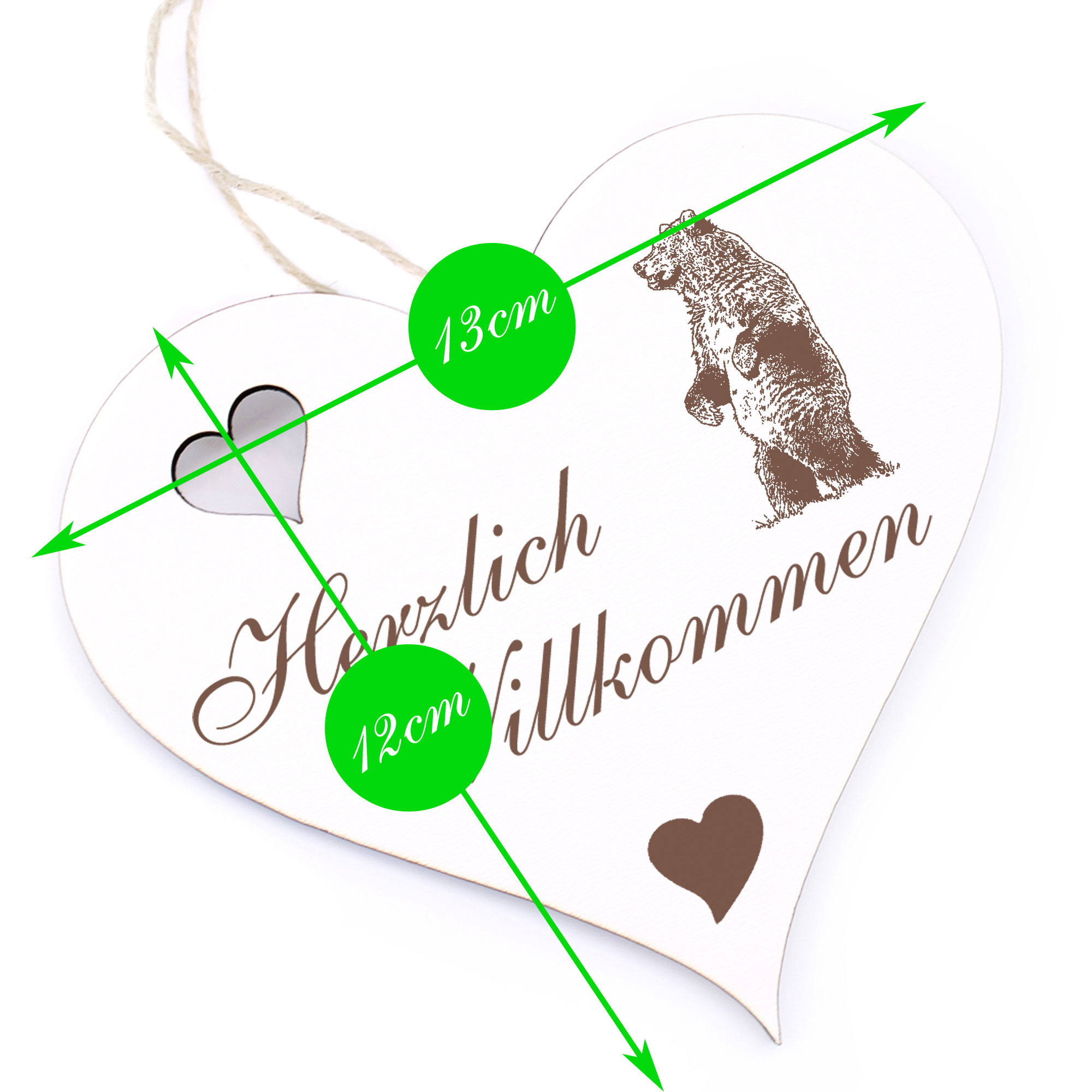 - DETAILS: Das Herzlich Willkommen Herz ist aus Holz (HDF) gefertigt, ist ca. 13cm x 12cm groß und wiegt etwa 41g. Das Juteband zum Aufhängen ist bereits an Ihrem Türschmuck angeknotet. Sie brauchen es nur noch an den Hauseingang bzw. an die Eingangstür hängen