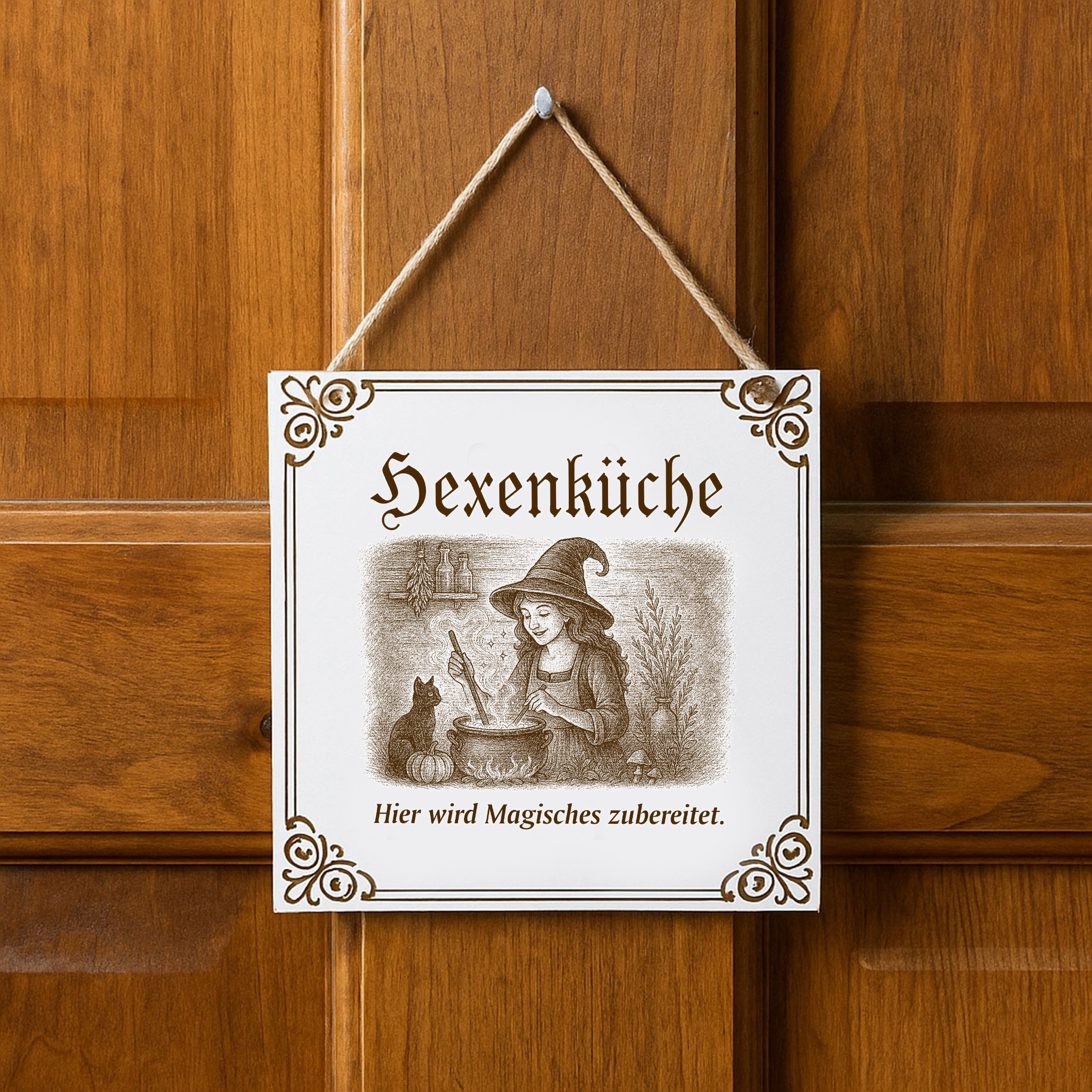 Hexenküche Hier wird magisches zubereitet Schild 15×15 cm – Weißes HDF Türschild mit Gravur