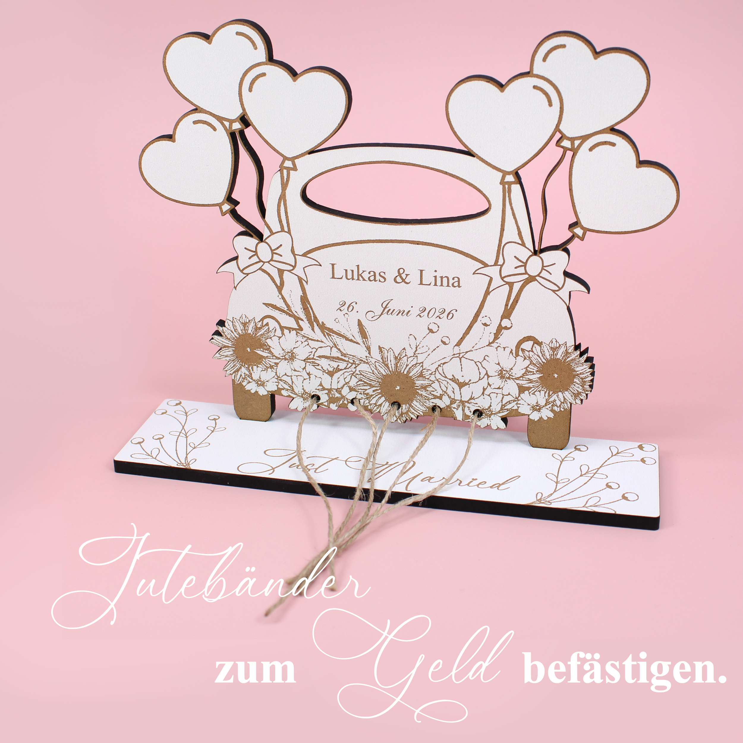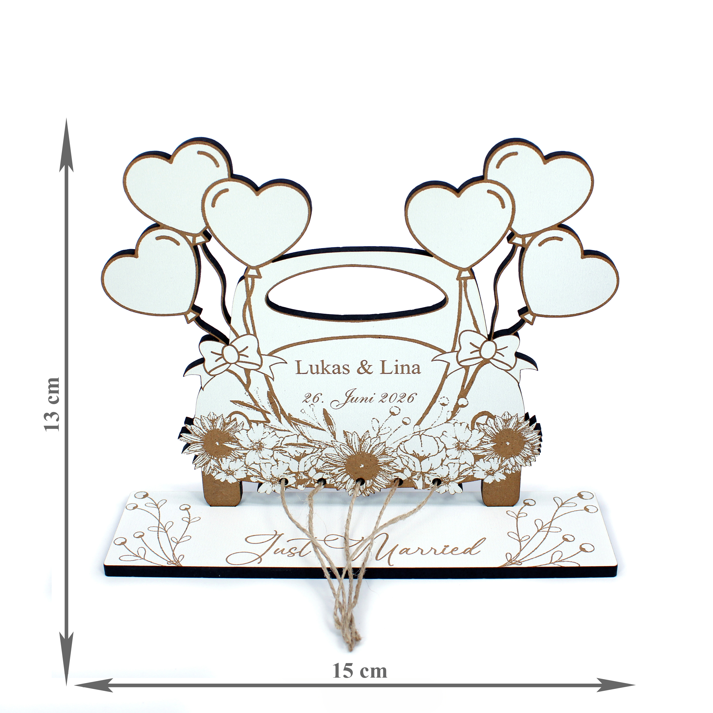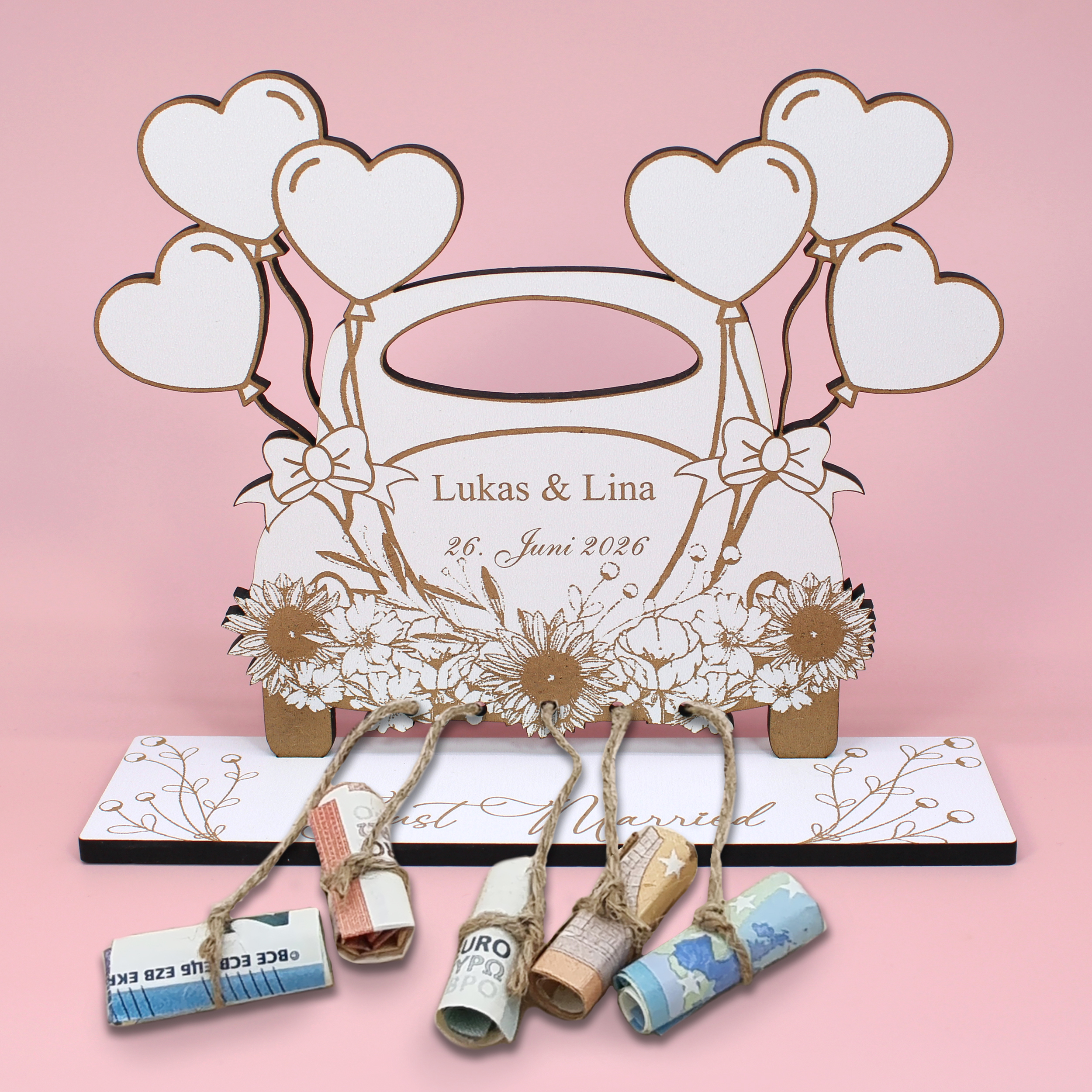 Das Geldgeschenk wird aus stabilem HDF gefertigt und überzeugt durch hochwertige Verarbeitung und liebevolle Details. Durch die Personalisierung mit Namen und Datum entsteht ein individuelles Präsent, das perfekt auf das Brautpaar abgestimmt ist.