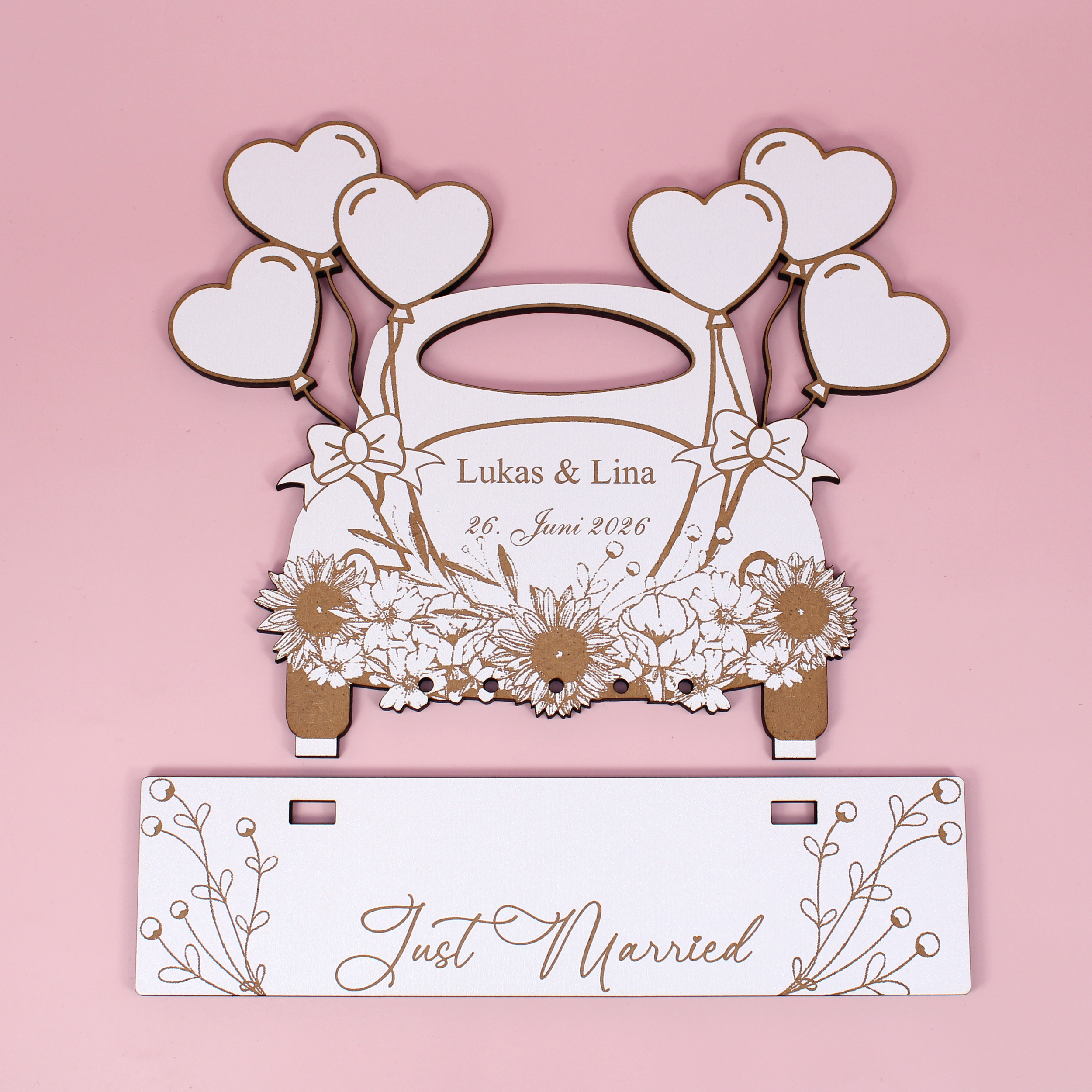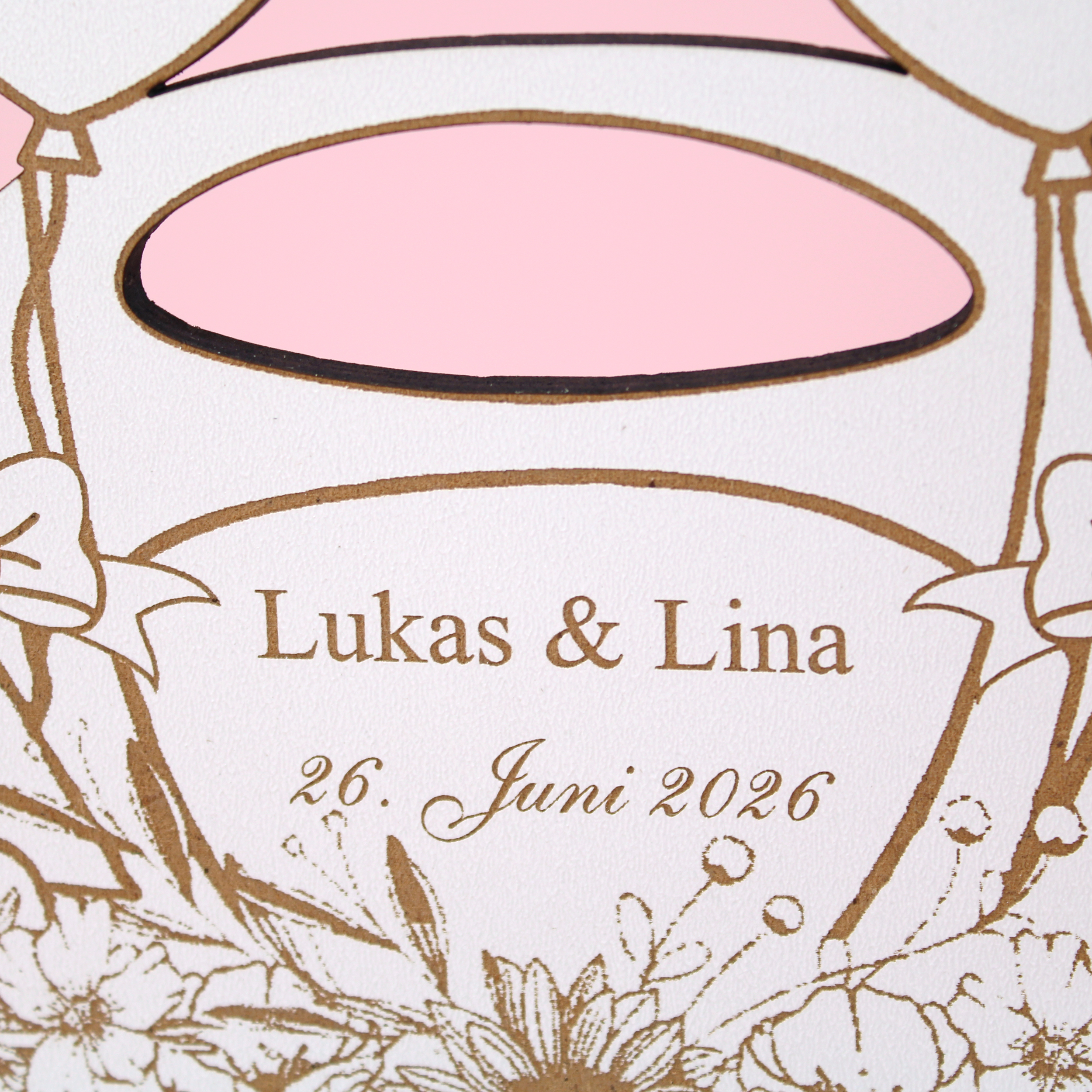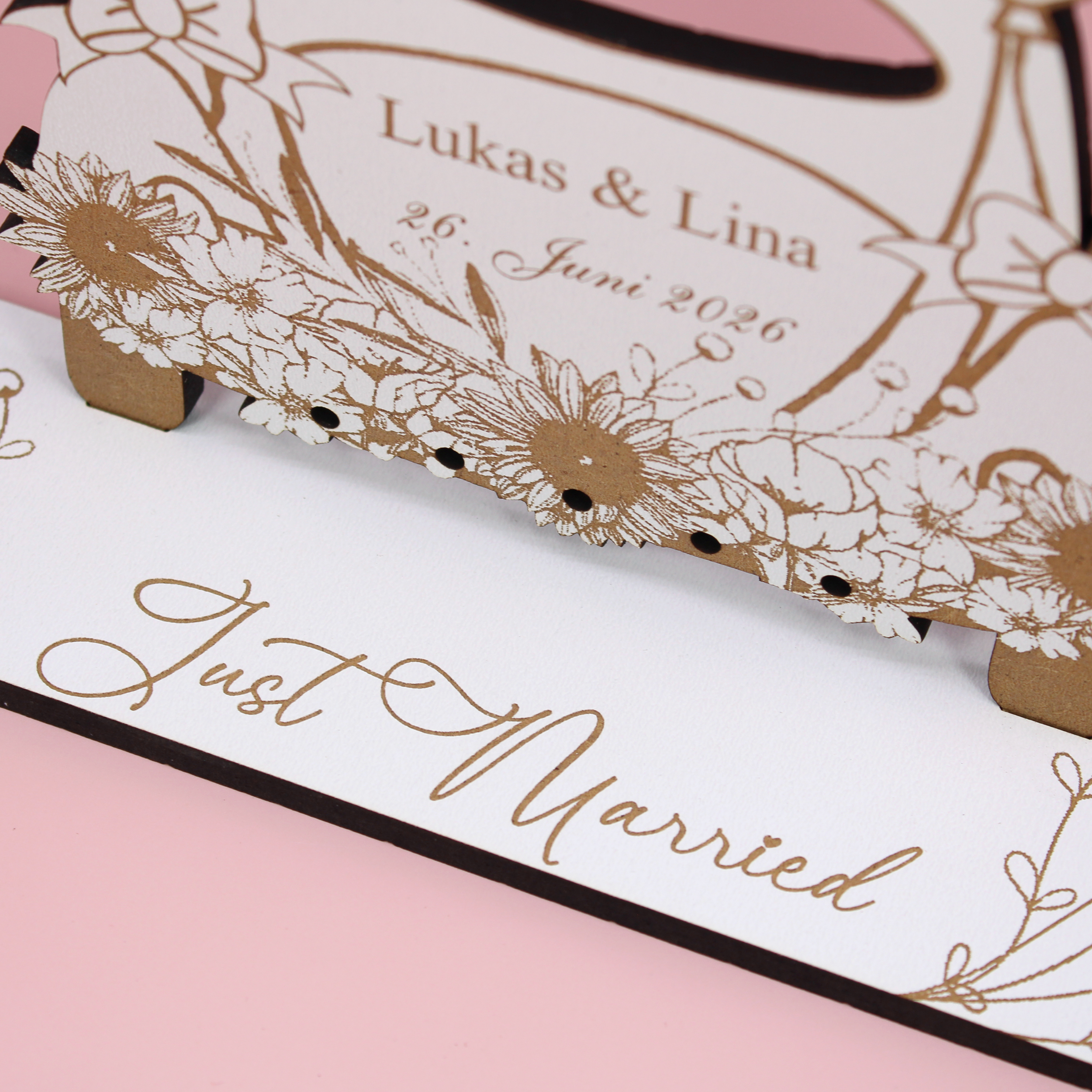 Das Geldgeschenk wird aus stabilem HDF gefertigt und überzeugt durch hochwertige Verarbeitung und liebevolle Details. Durch die Personalisierung mit Namen und Datum entsteht ein individuelles Präsent, das perfekt auf das Brautpaar abgestimmt ist.