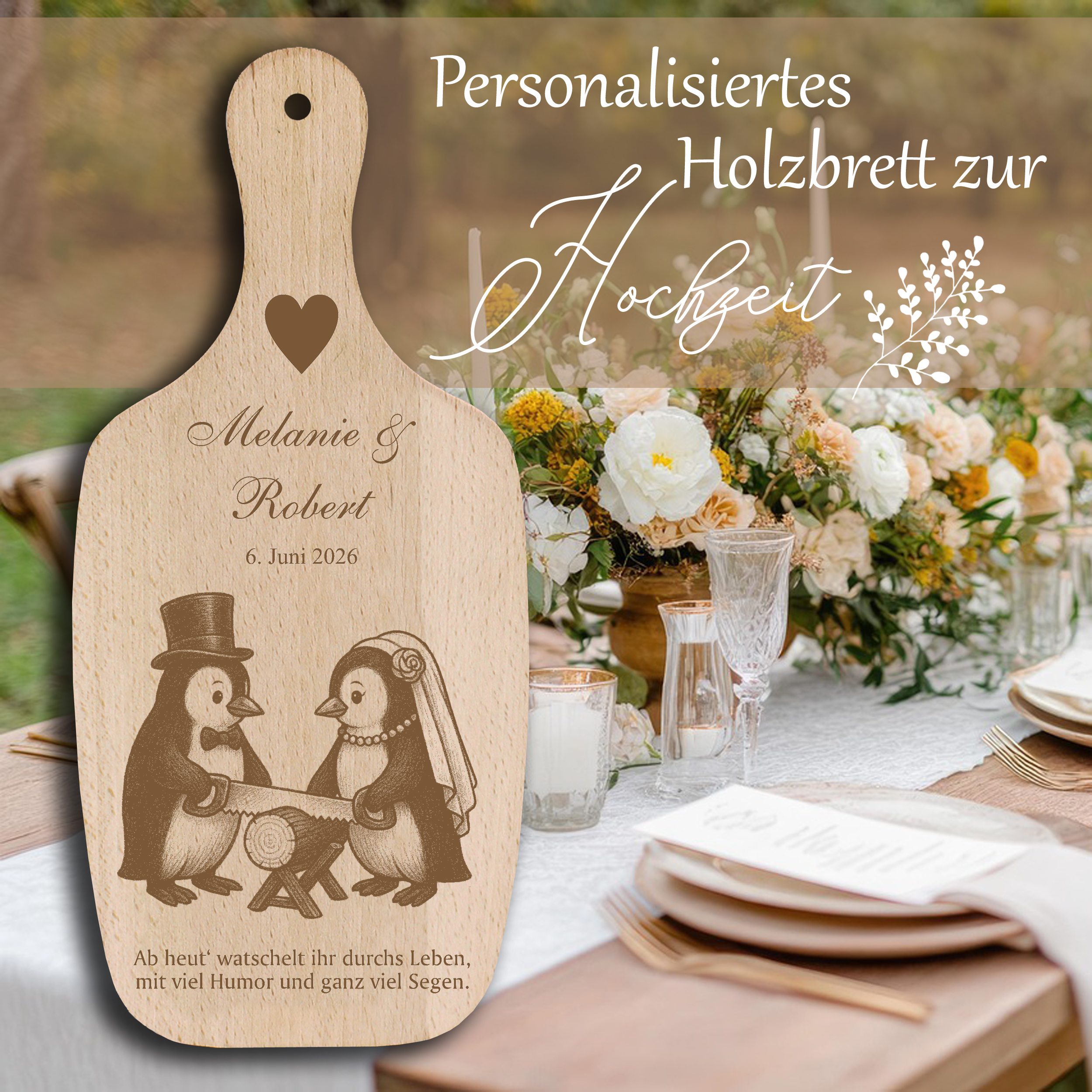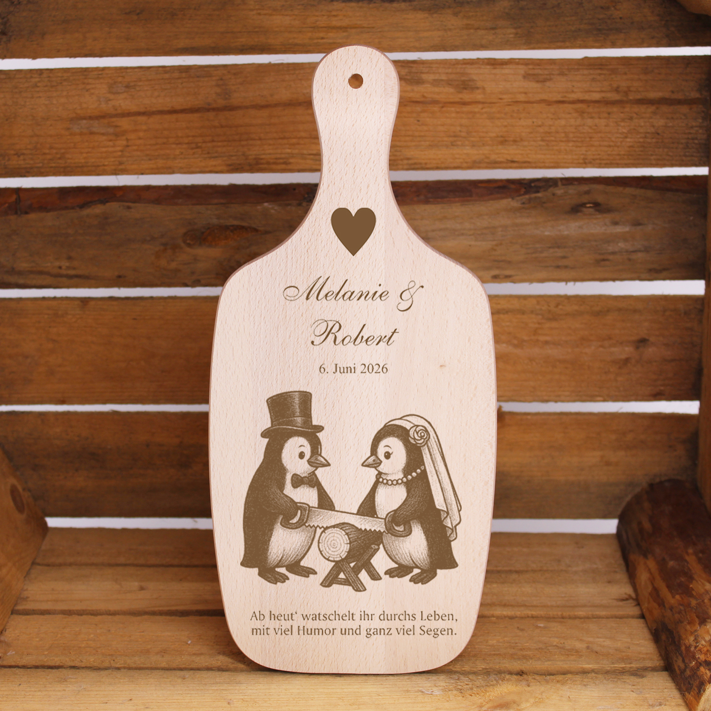 - Frühstücksbrettchen „Pinguin Hochzeit“ – Liebevoll graviertes Holzbrett mit Pinguinpaar das einen Holzstamm sägt und dem Spruch „Ab heut’ watschelt ihr durchs Leben, mit viel Humor und ganz viel Segen.“ – perfektes Hochzeitsgeschenk für Paare.