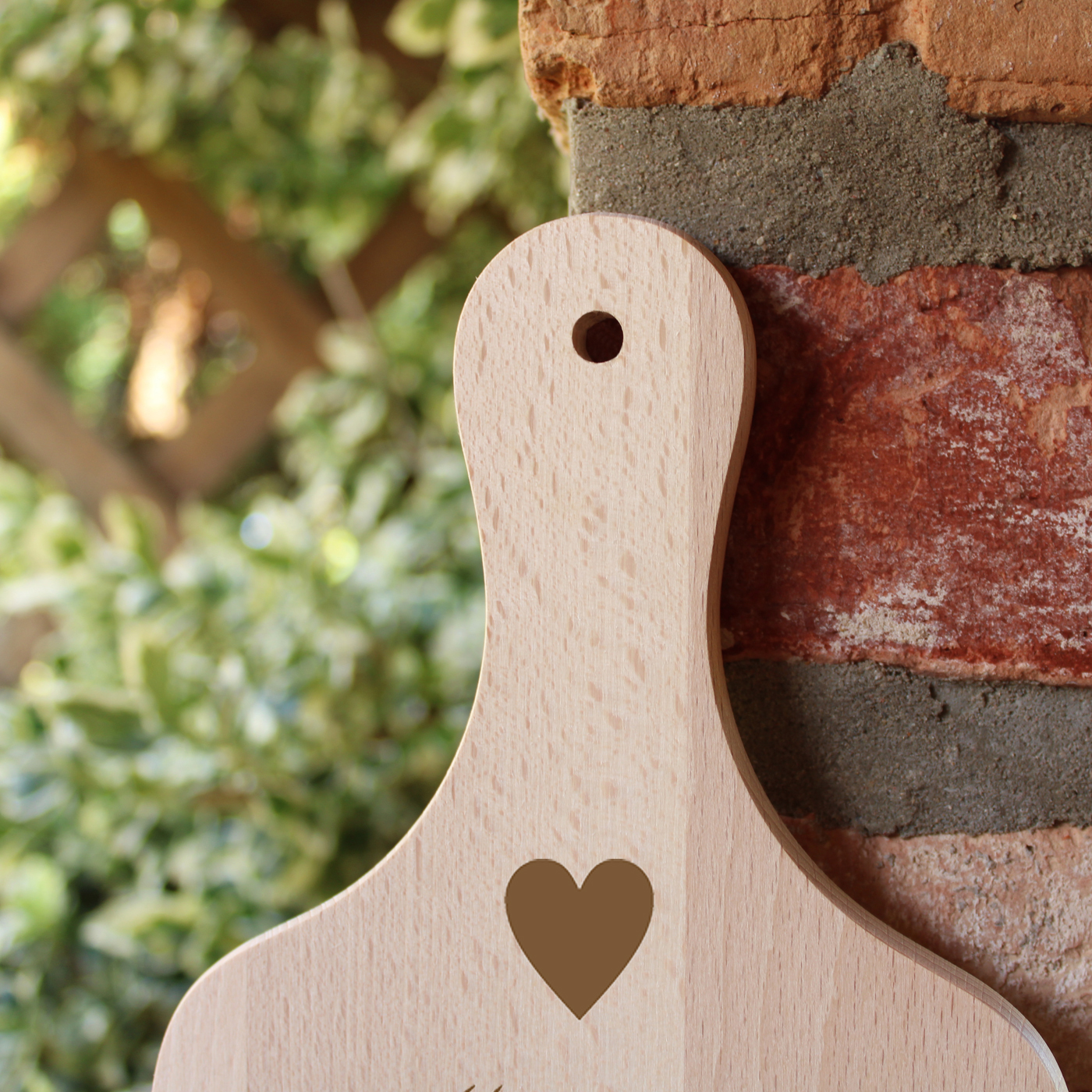 Mit einer Größe von 33 cm × 15 cm eignet sich das Brett ideal als Frühstücksbrett, Servierbrett oder Dekobrett. Es kann zudem mit Namen und Hochzeitsdatum personalisiert werden – so wird aus jedem Brett ein Einzelstück und bleibendes Andenken an die Hochzeit.