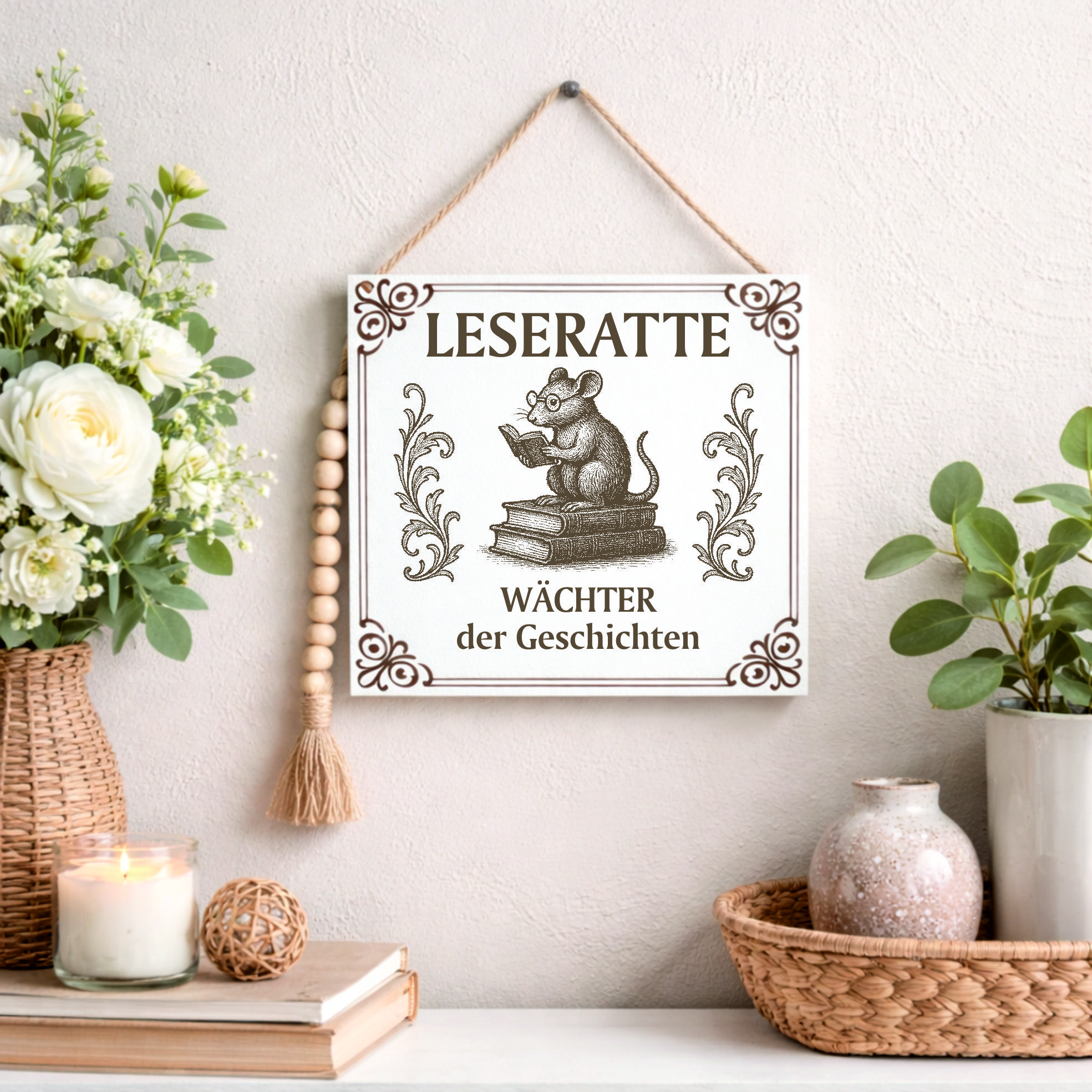 Holzschild Leseratte – Wächter der Geschichten – Bücherliebhaber Deko 15 x 15 cm