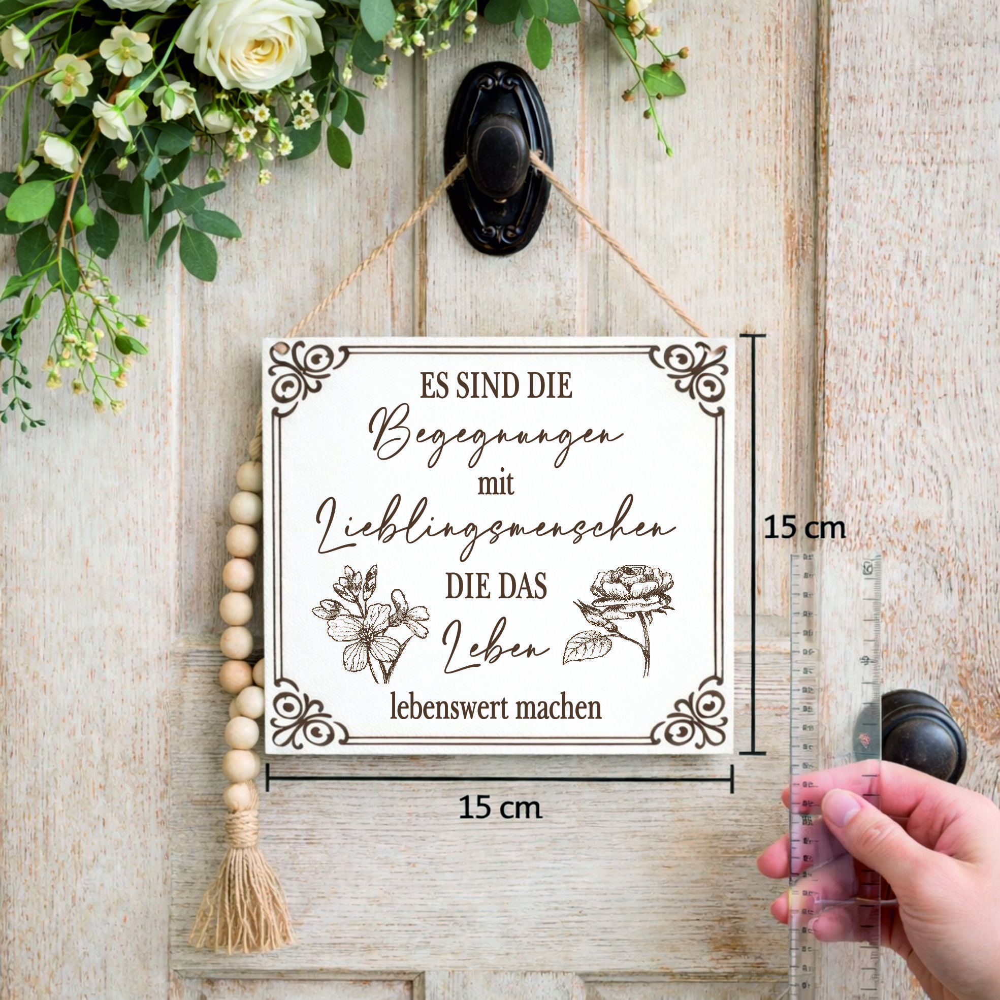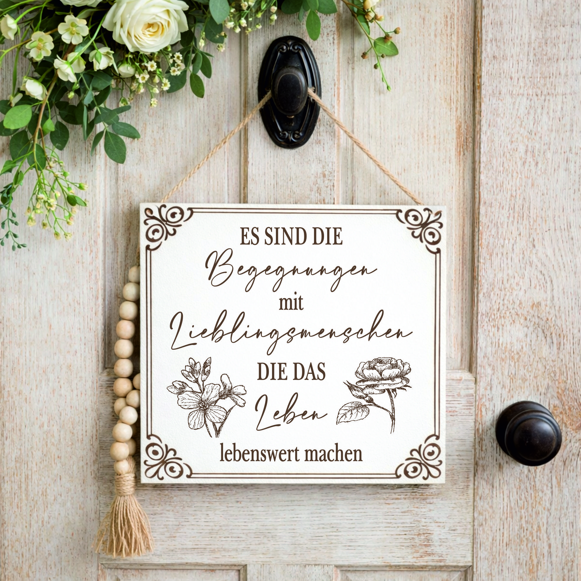 Gefertigt aus stabilem HDF und veredelt mit einer präzisen braunen Lasergravur, überzeugt das Schild durch seine langlebige Qualität und detailreiche Gestaltung. Die floralen Motive verleihen dem Design eine elegante und harmonische Ausstrahlung.