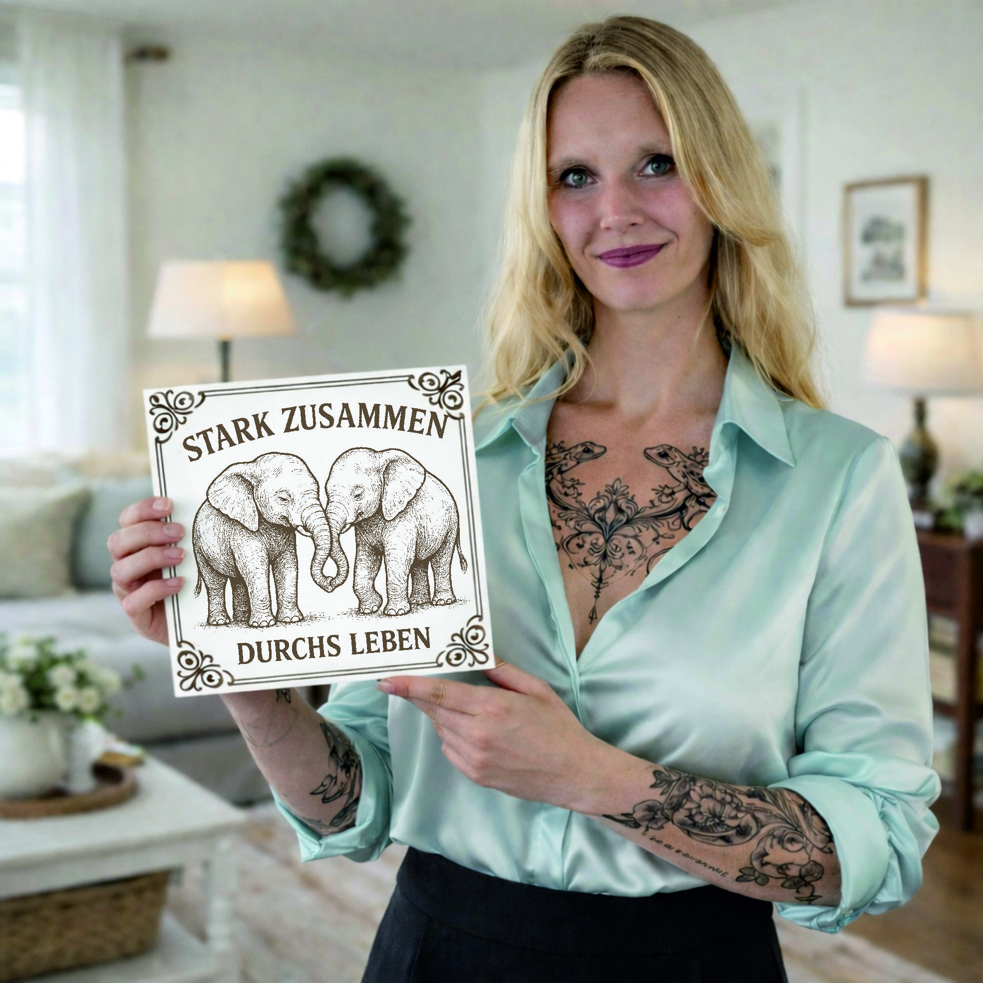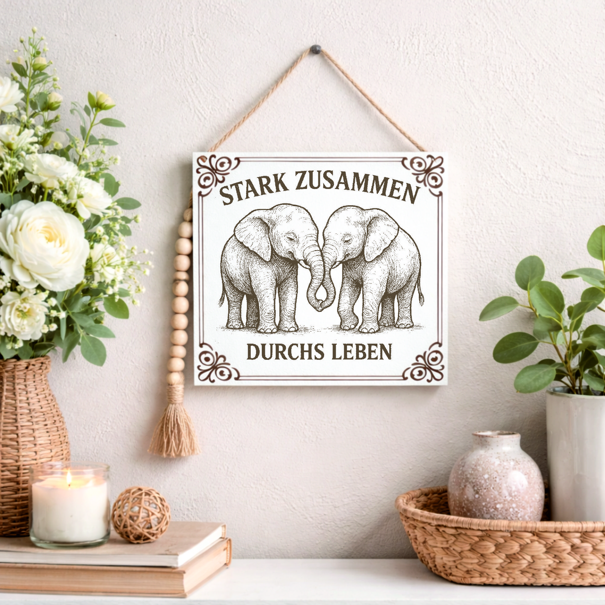 Die beiden Elefanten stehen für eine starke Verbindung – perfekt als Geschenk für Paare, die ihren gemeinsamen Weg feiern möchten. Die hochwertige Lasergravur auf HDF-Holz sorgt für eine edle Optik und macht jedes Schild zu einer besonderen Dekoration.