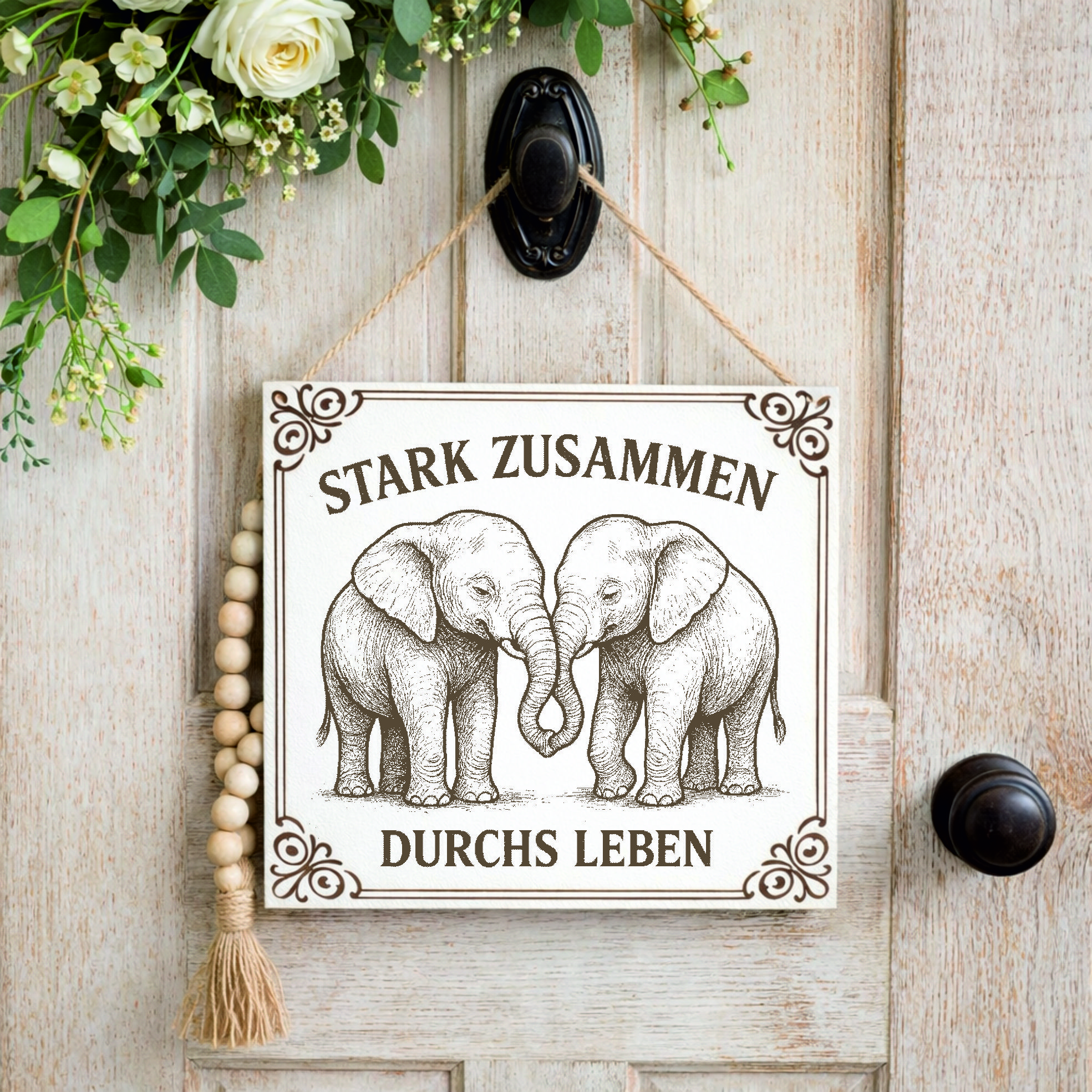 Dieses liebevoll gestaltete Holzschild mit Elefantenpaar und der Gravur „Stark zusammen durchs Leben“ ist ein wunderschönes Symbol für Liebe, Zusammenhalt und Partnerschaft.