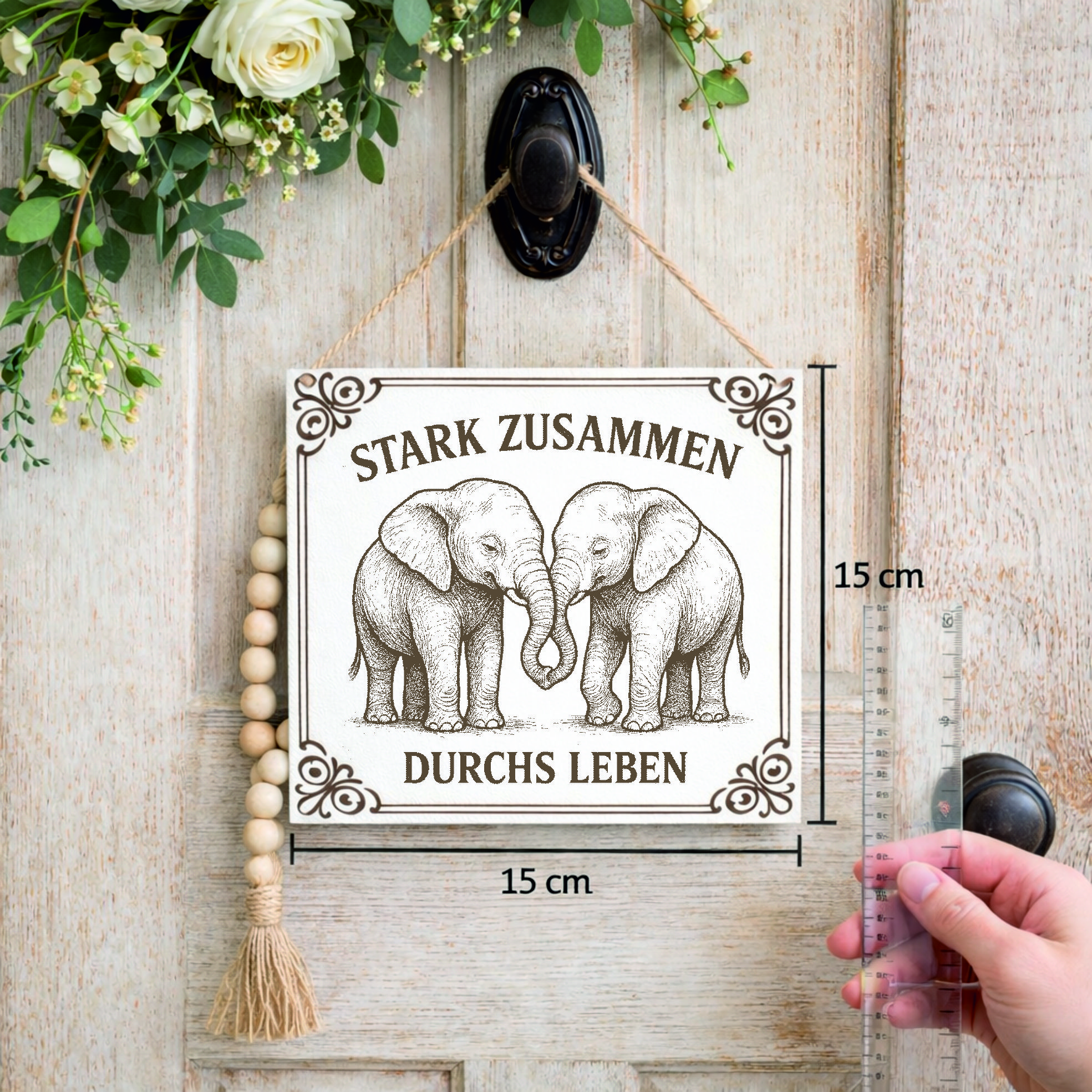 Holzschild Stark zusammen durchs Leben | Elefantenpaar Gravur | Geschenk für Paare | Hochzeitsgeschenk | Valentinstag Deko | Holzschild 15x15 cm