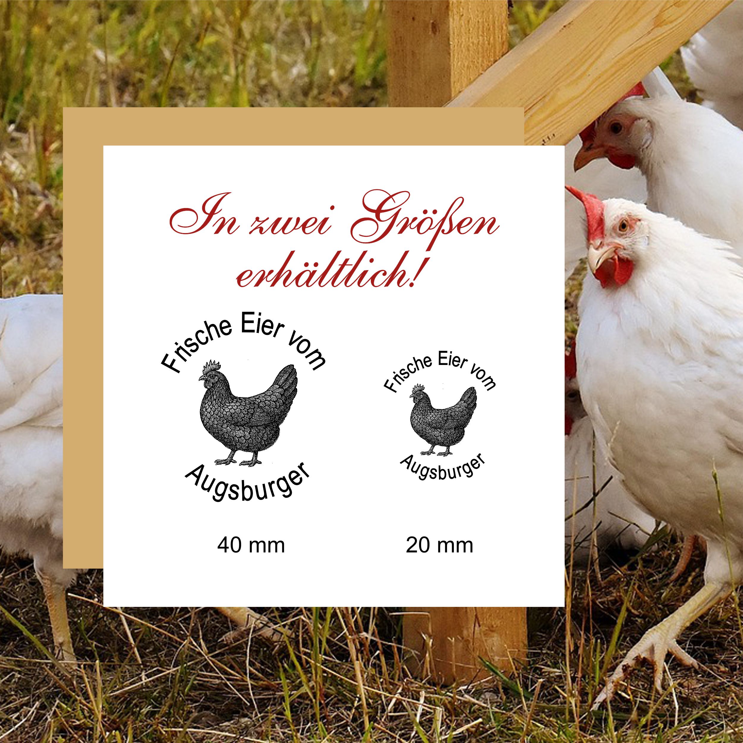 Holzstempel personalisiert „Frische Eier vom Augsburger“ – Hühner Motivstempel Huhn
