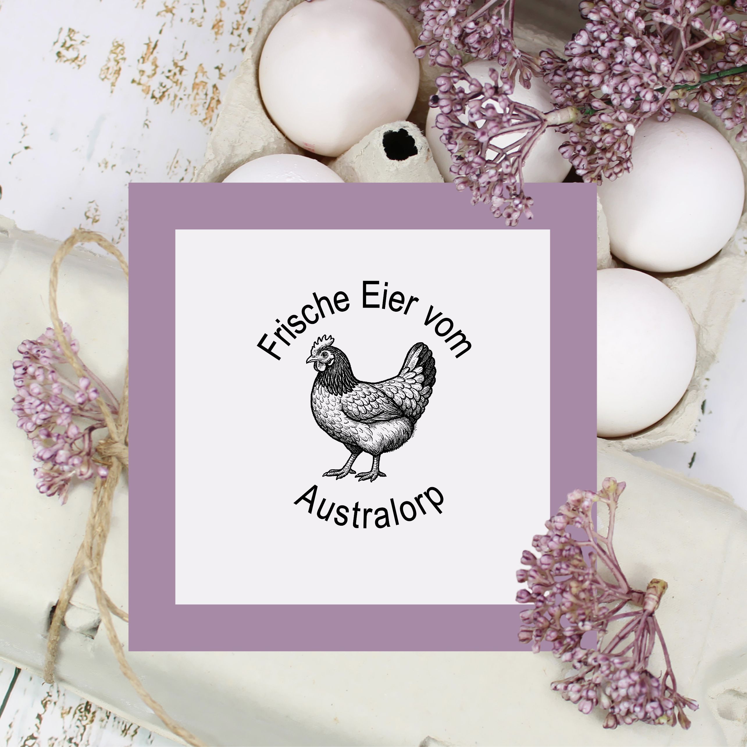 Holzstempel personalisiert „Frische Eier vom Australorp“ – Hühner Motivstempel Huhn