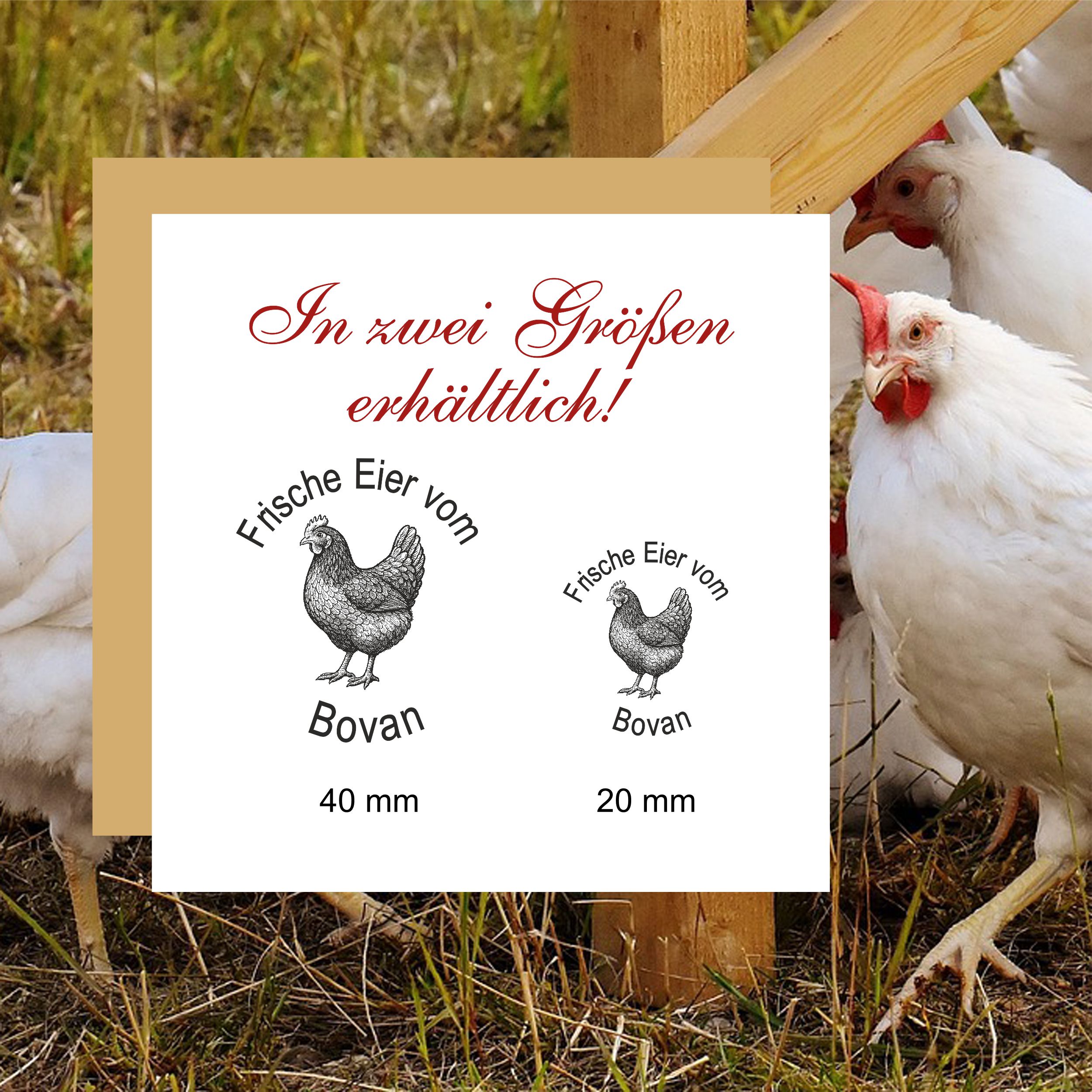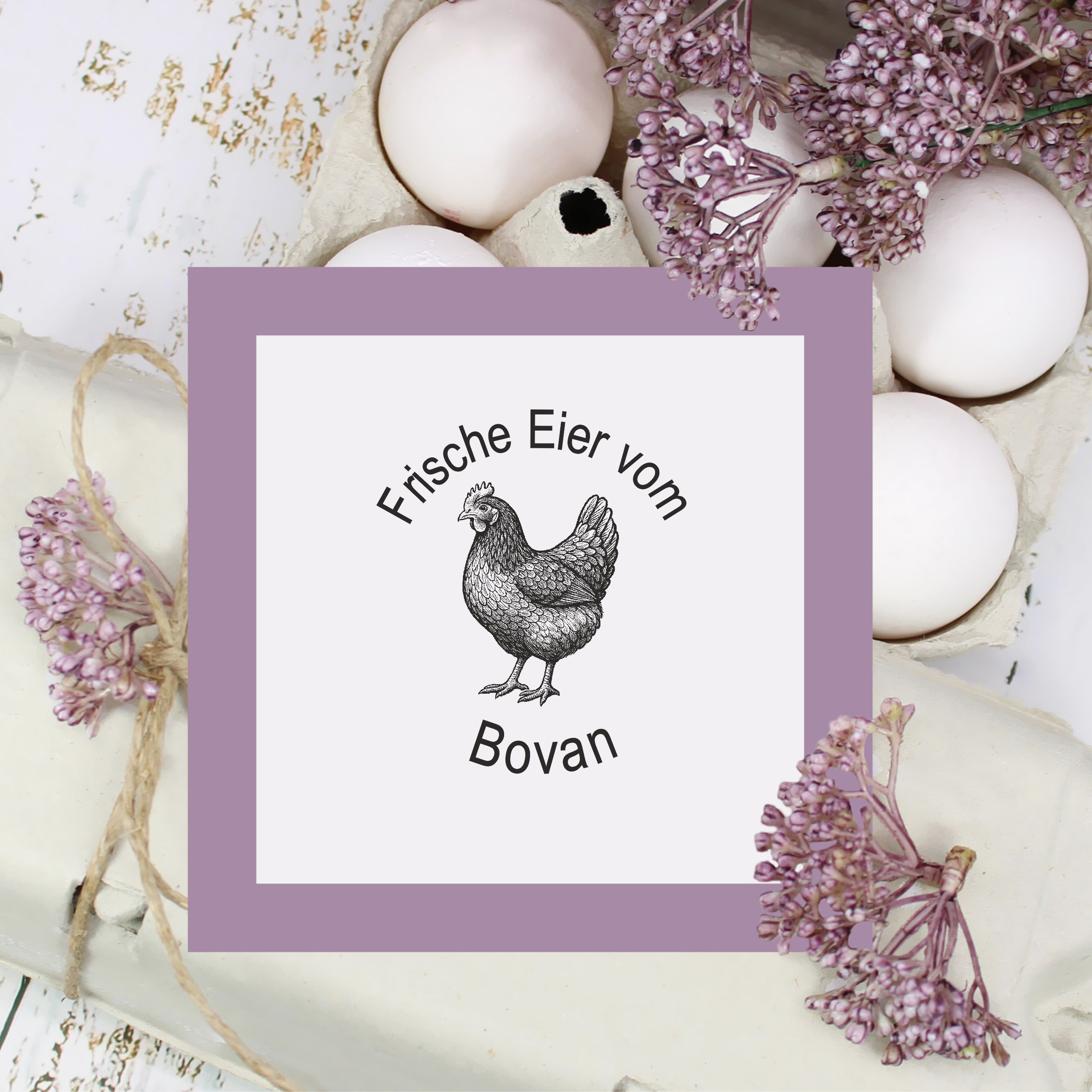 Holzstempel personalisiert „Frische Eier vom Bovan“ – Hühner Motivstempel Huhn