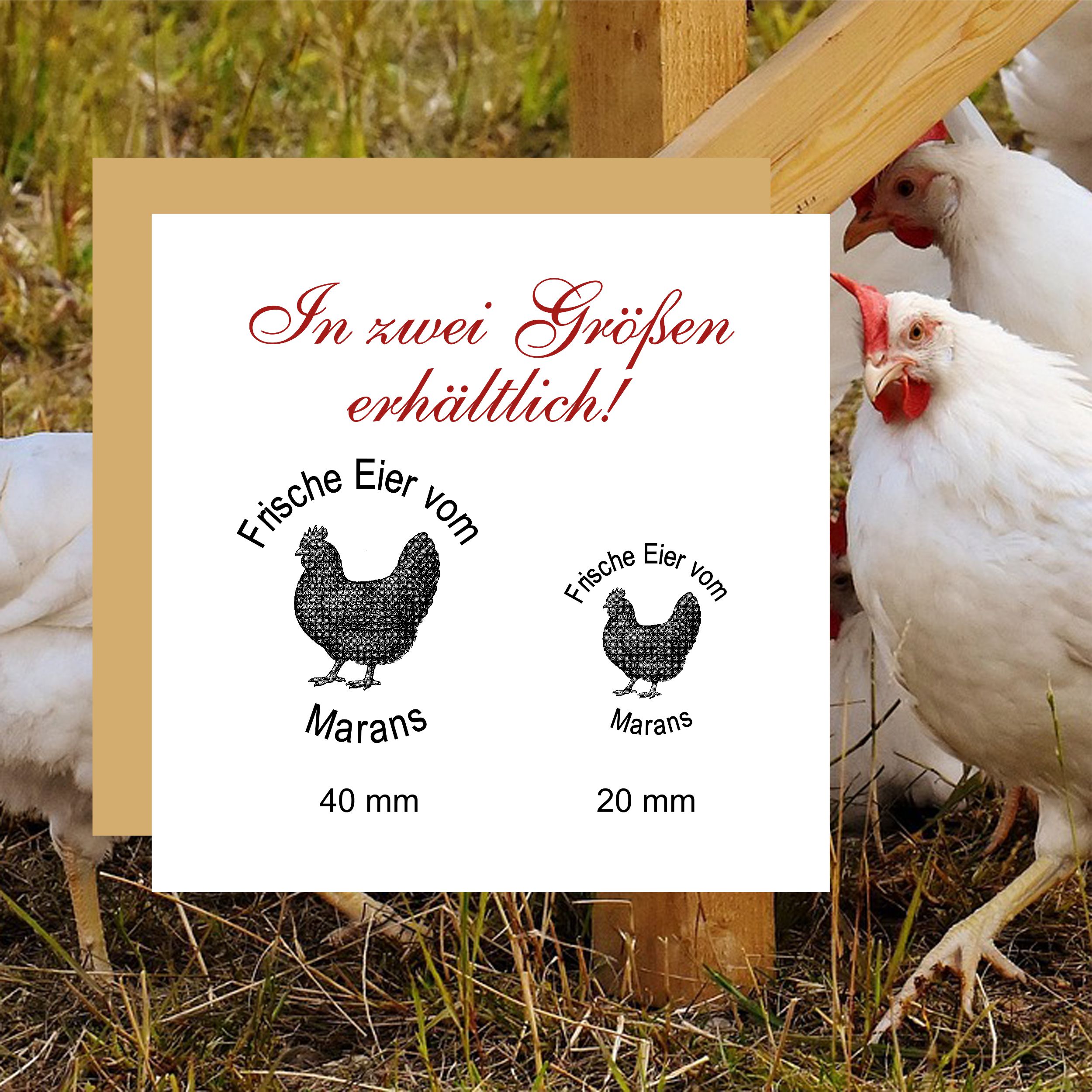 Holzstempel personalisiert „Frische Eier vom Marans“ – Hühner Motivstempel Huhn