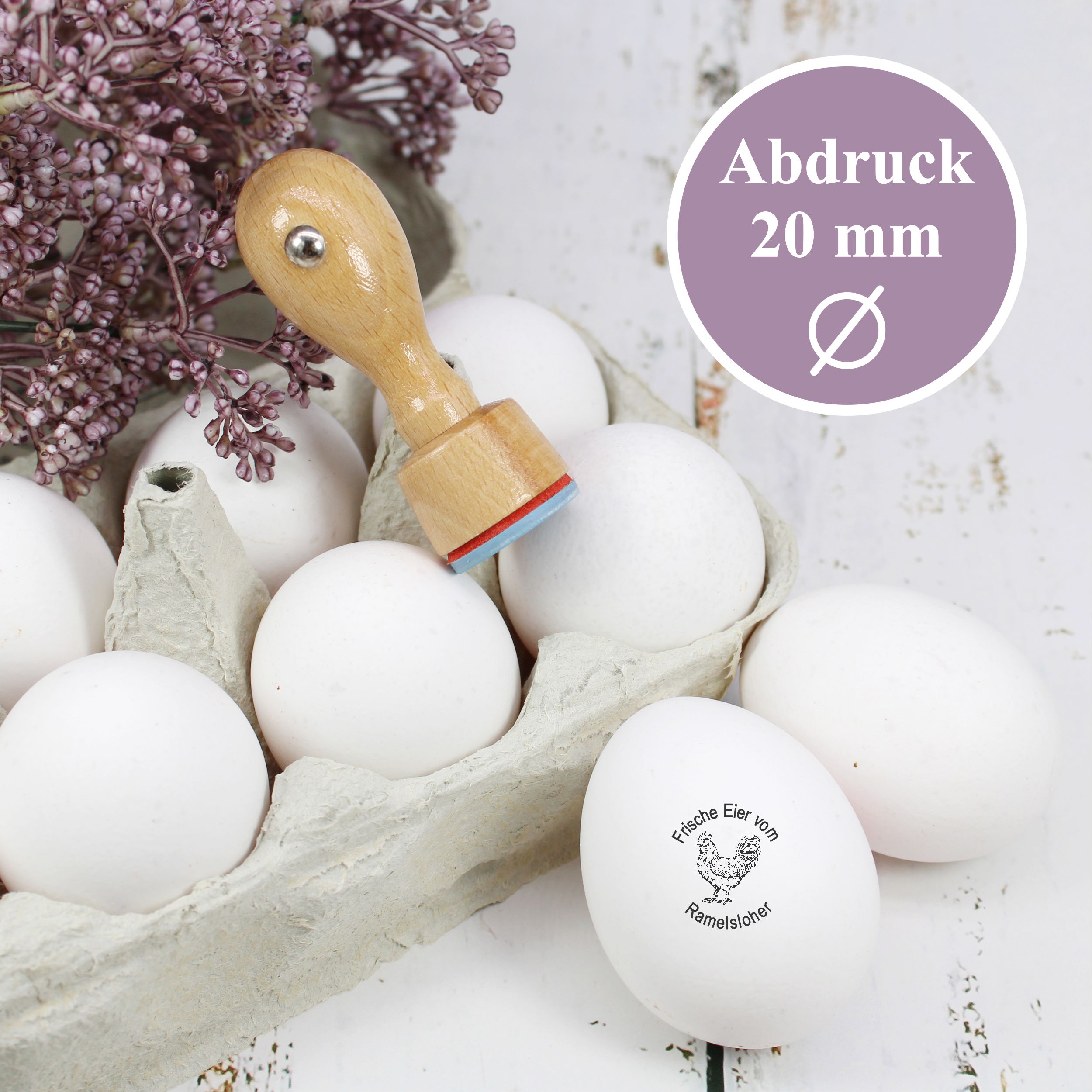 Holzstempel personalisiert „Frische Eier vom Ramelsloher“ – Hühner Motivstempel Huhn