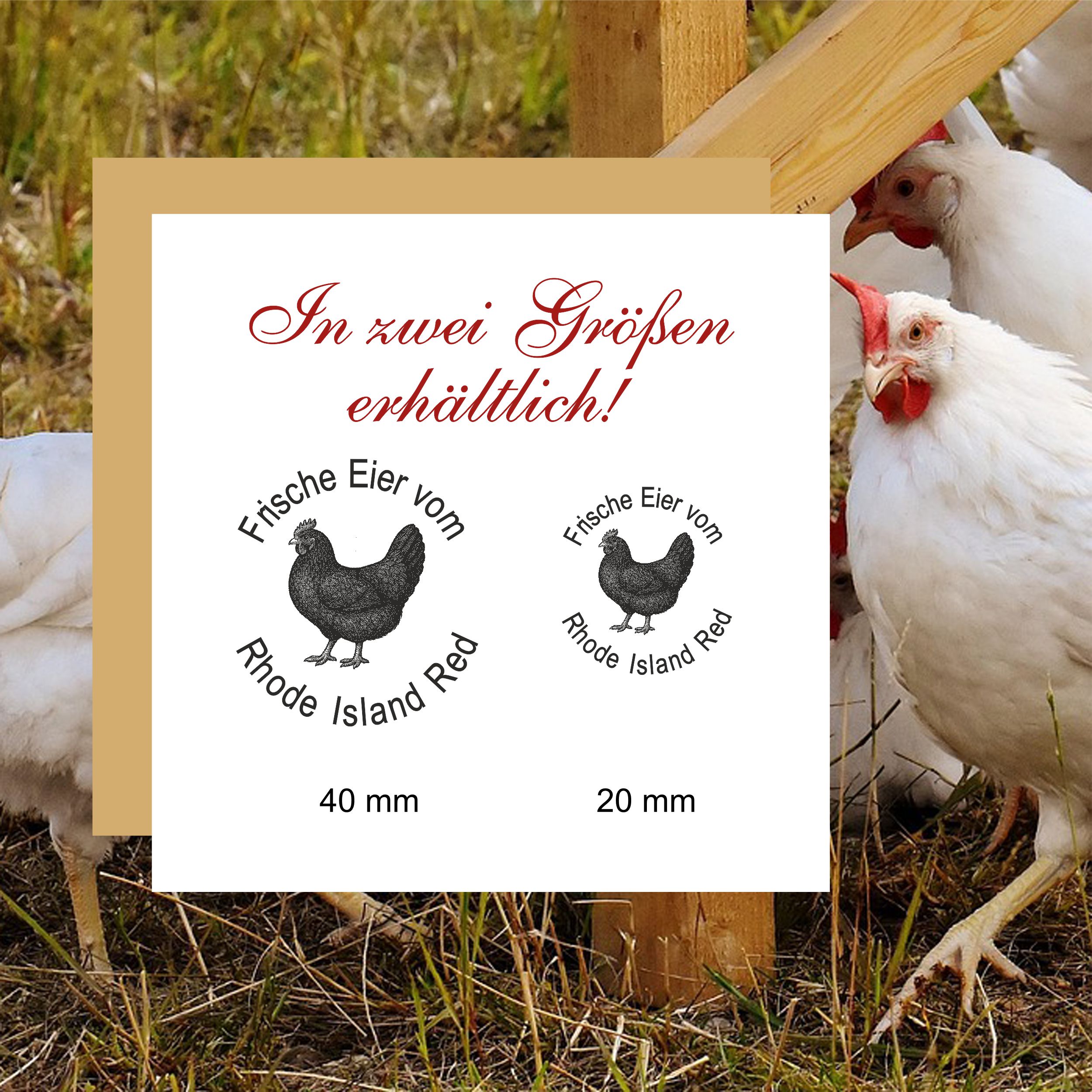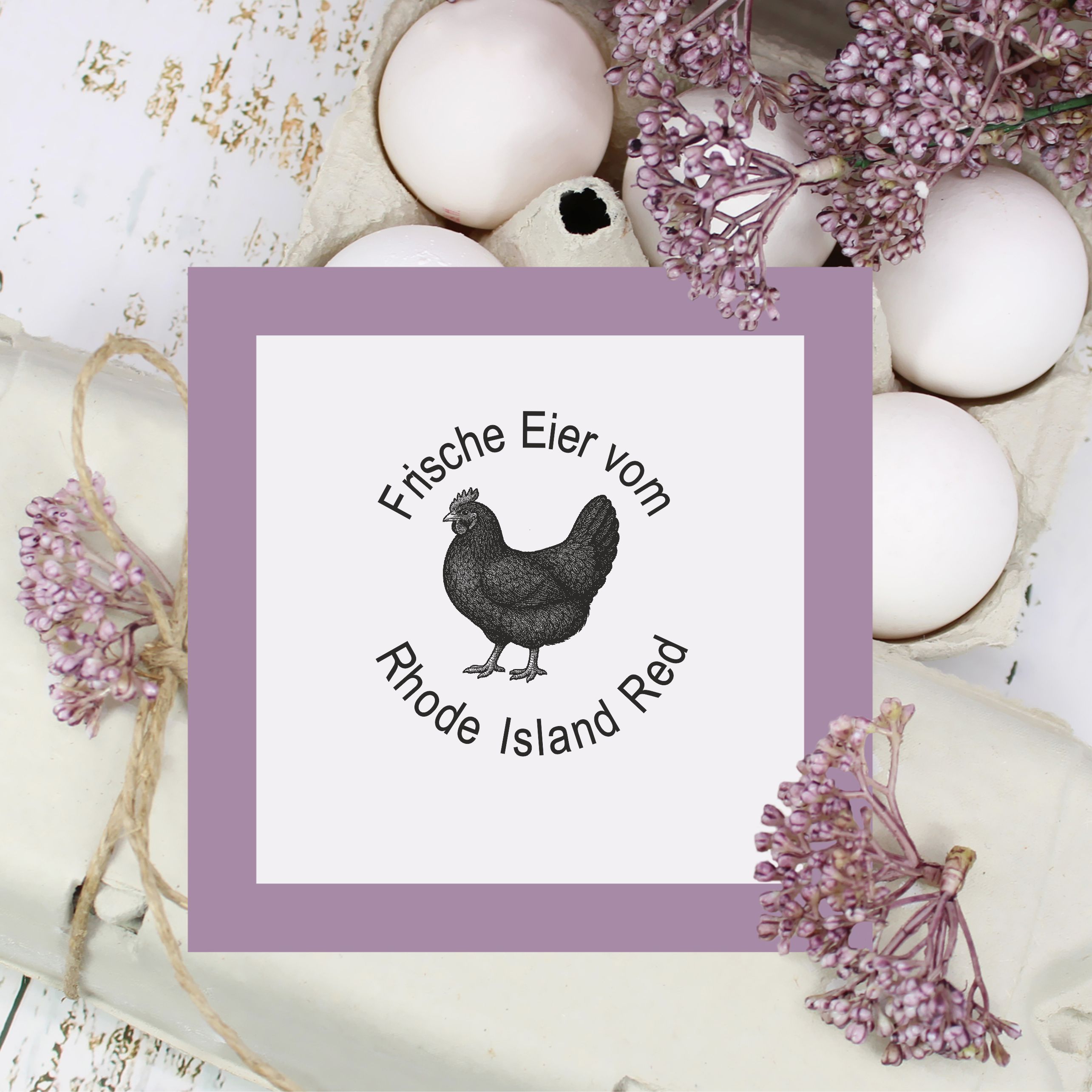 Holzstempel personalisiert „Frische Eier vom Rhode Island Red“ – Hühner Motivstempel Huhn Rhodeländer