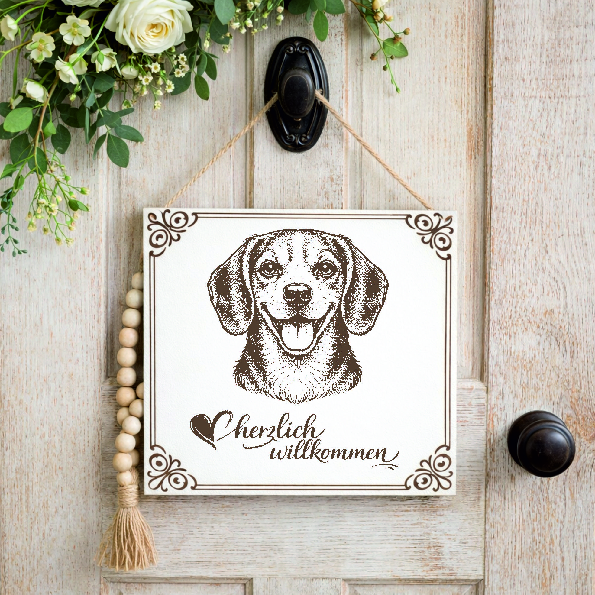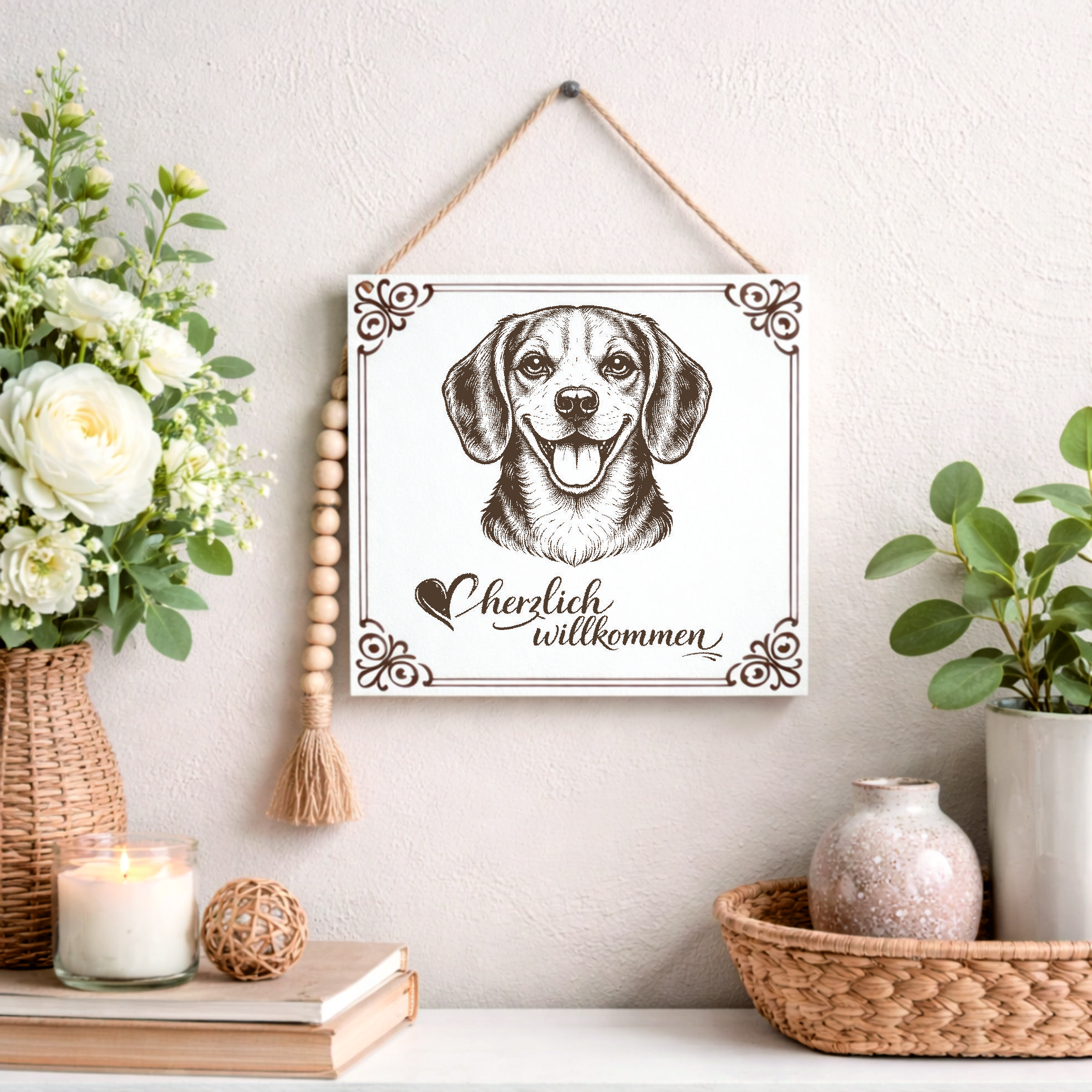 Dieses stilvolle Willkommensschild mit Hundemotiv ist eine schöne Dekoration für alle, die ihre Liebe zu Hunden auch im Eingangsbereich zeigen möchten.