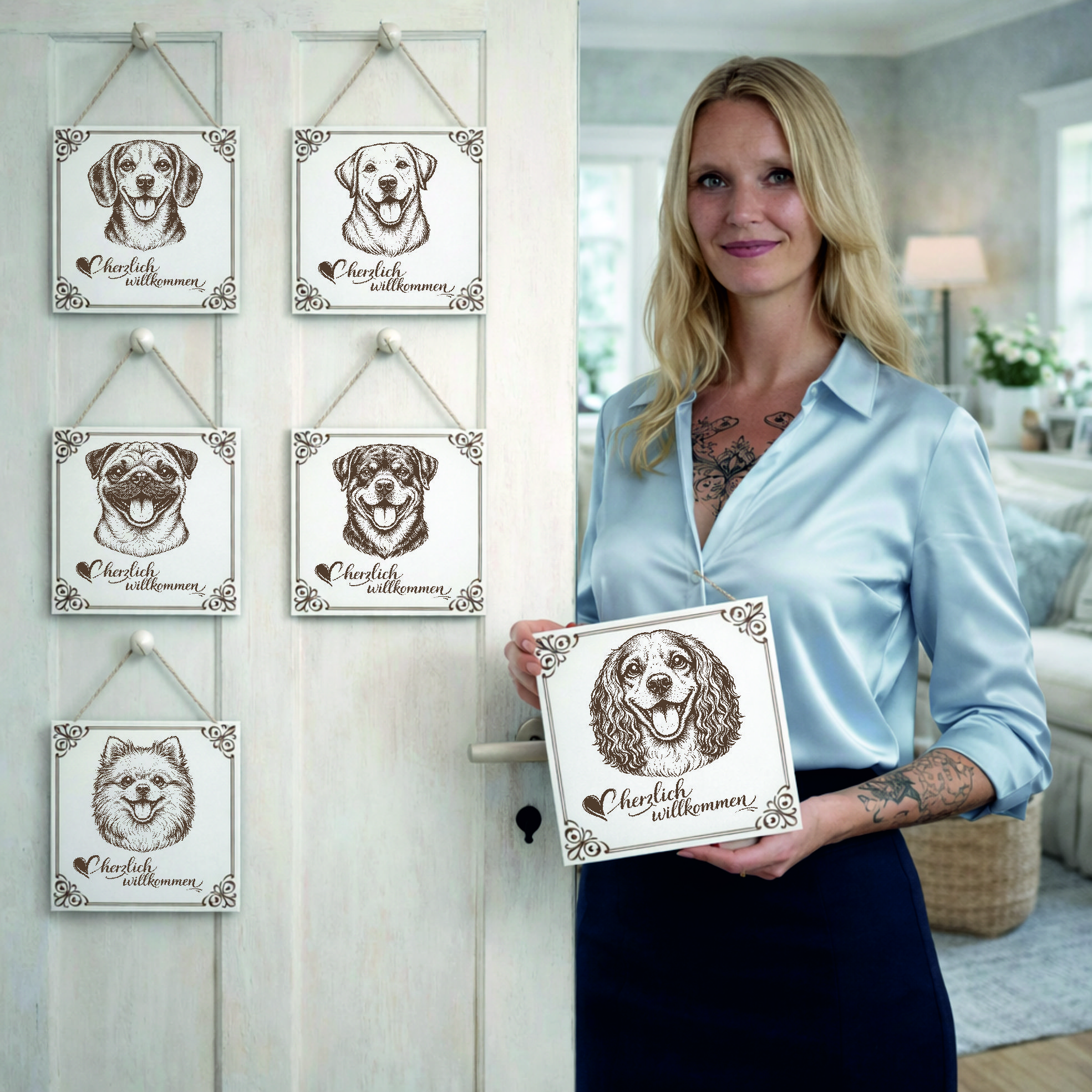 Willkommensschild Hund mit Ihrer Hunderasse – persönlicher Eingangsbereich: Individuelles Türschild mit Hundemotiv und Schriftzug „Herzlich Willkommen“ – wählen Sie aus vielen beliebten Hunderassen Ihr Wunschmotiv und gestalten Sie Ihren Eingangsbereich persönlich und einladend.
