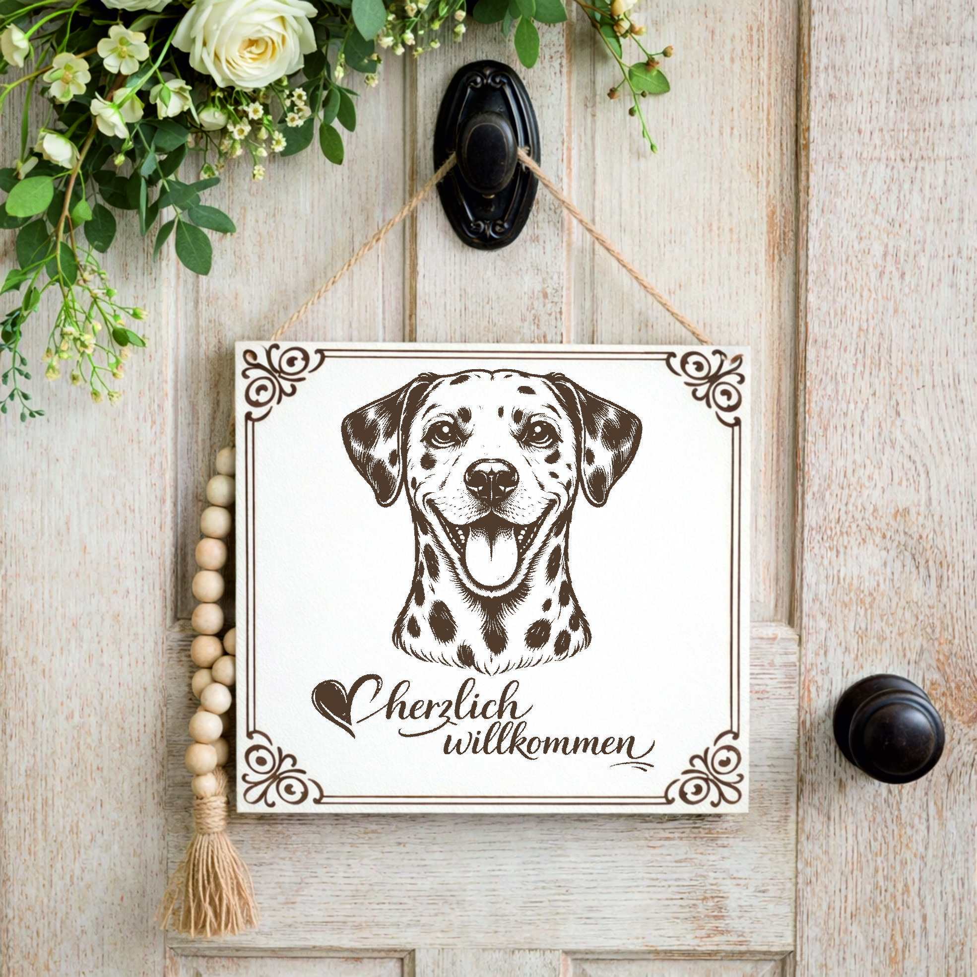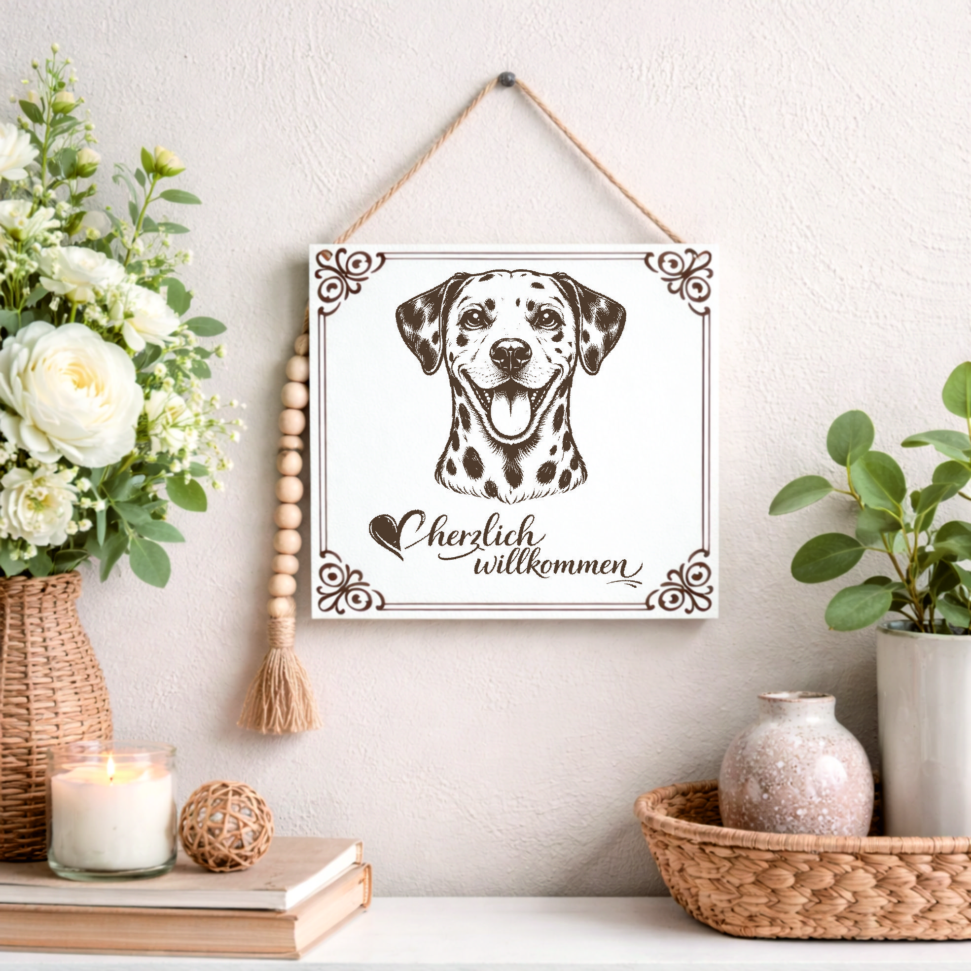 Dieses stilvolle Willkommensschild mit Hundemotiv ist eine schöne Dekoration für alle, die ihre Liebe zu Hunden auch im Eingangsbereich zeigen möchten.