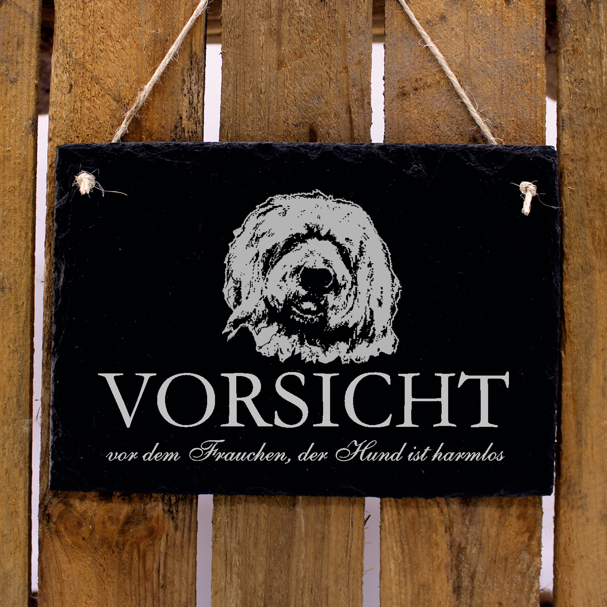 Bobtail Besitzer aufgepasst! Mit unserem Hundeschild Bobtail Schild zaubern Sie mit Sicherheit jedem Gast ein Lächeln ins Gesicht und zeitgleich warnen Sie jeden Besucher vor Ihrem Liebling. Der lustige Spruch - Vorsicht vor dem Frauchen, der Hund ist harmlos - vertreibt jede schlechte Stimmung und löst bei jedem Betrachter Emotionen aus. So wie Ihr Bobtail bei Ihnen! Unser Hundeschild Bobtail hinterlässt als persönliches Geschenk zum Geburtstag, zu Weihnachten, Nikolaus, Ostern und anderen Feiertagen bei jedem Bobtail-Besitzer stets einen persönlichen, sowie bleibenden Eindruck. Machen Sie ihren Freunden eine Freude oder verschönern Sie ihr Zuhause. Diese liebevoll hergestellte und gestaltete Schiefertafel eignet sich als schöne Dekoration für jede Wohnung, jedes Haus und jedes Büro. Das perfekte Bobtail Geschenk!