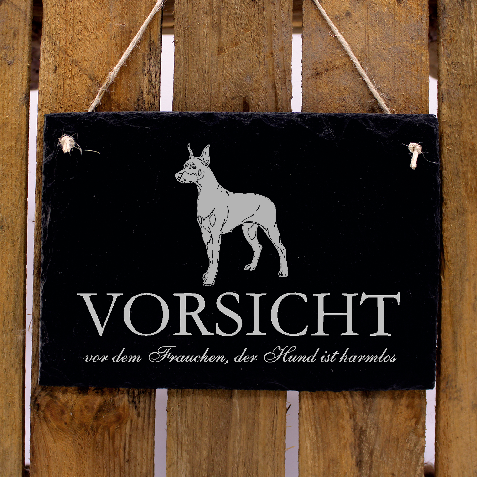 Dobermann Besitzer aufgepasst! Mit unserem Hundeschild Dobermann Schild zaubern Sie mit Sicherheit jedem Gast ein Lächeln ins Gesicht und zeitgleich warnen Sie jeden Besucher vor Ihrem Liebling. Der lustige Spruch - Vorsicht vor dem Frauchen, der Hund ist harmlos - vertreibt jede schlechte Stimmung und löst bei jedem Betrachter Emotionen aus. So wie Ihr Dobermann bei Ihnen! Unser Hundeschild Dobermann hinterlässt als persönliches Geschenk zum Geburtstag, zu Weihnachten, Nikolaus, Ostern und anderen Feiertagen bei jedem Dobermann-Besitzer stets einen persönlichen, sowie bleibenden Eindruck. Machen Sie ihren Freunden eine Freude oder verschönern Sie ihr Zuhause. Diese liebevoll hergestellte und gestaltete Schiefertafel eignet sich als schöne Dekoration für jede Wohnung, jedes Haus und jedes Büro. Das perfekte Dobermann Geschenk!