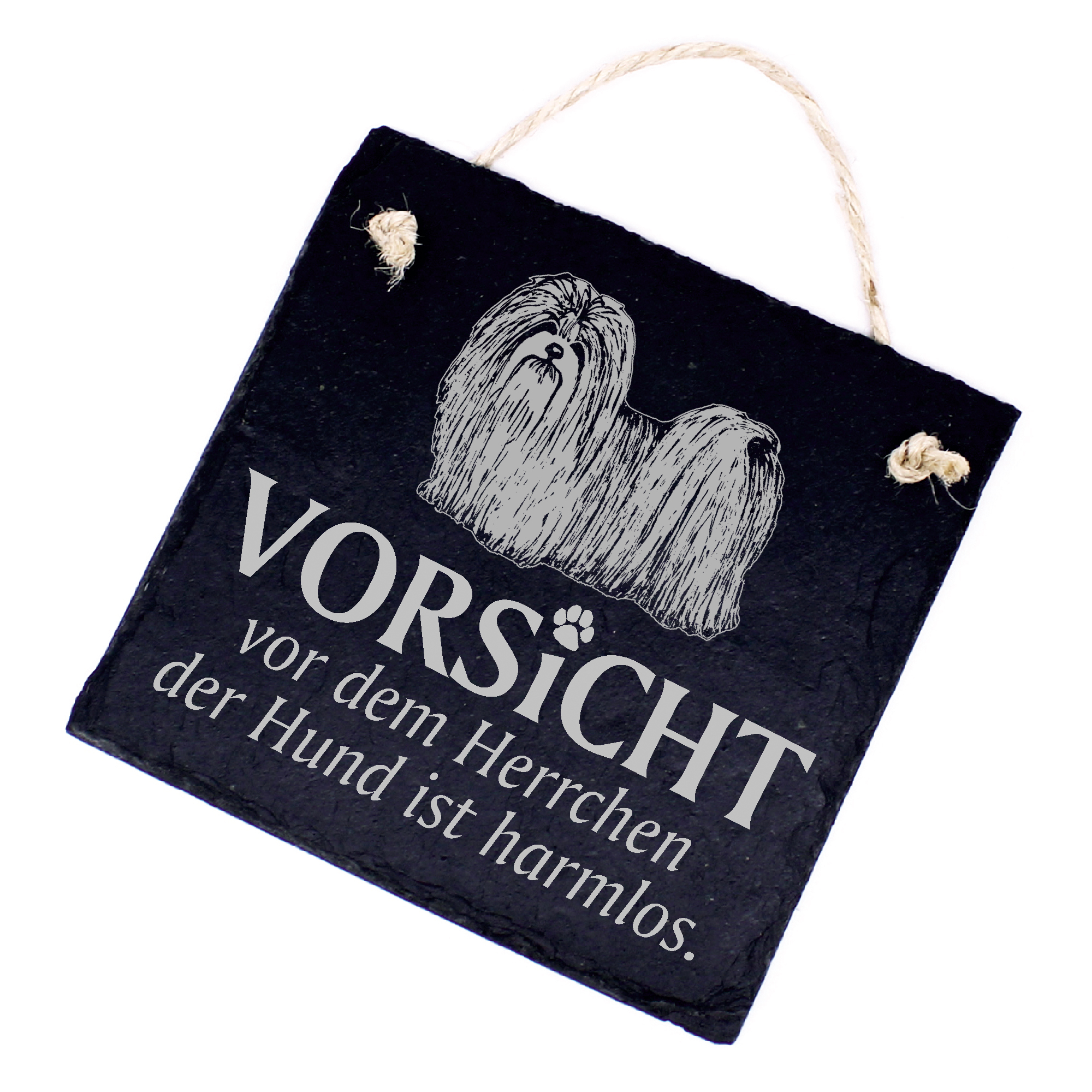 Lhasa Apso Besitzer aufgepasst! Mit unserem Hundeschild Lhasa Apso zaubern Sie mit Sicherheit jedem Gast ein Lächeln ins Gesicht und zeitgleich warnen Sie jeden Besucher vor Ihrem Liebling. Der lustige Spruch - Vorsicht vor dem Herrchen, der Hund ist harmlos - vertreibt jede schlechte Stimmung und löst bei jedem Betrachter Emotionen aus. So wie Ihr Lhasa Apso bei Ihnen! Unser Hundeschild Lhasa Apso hinterlässt als persönliches Geschenk zum Geburtstag, zu Weihnachten, Nikolaus, Ostern und anderen Feiertagen bei jedem Airedale Terrier-Besitzer stets einen persönlichen, sowie bleibenden Eindruck. Machen Sie ihren Freunden eine Freude oder verschönern Sie ihr Zuhause. Diese liebevoll hergestellte und gestaltete Schiefertafel eignet sich als schöne Dekoration für jede Wohnung, jedes Haus und jedes Büro. Das perfekte Lhasa Apso Geschenk!