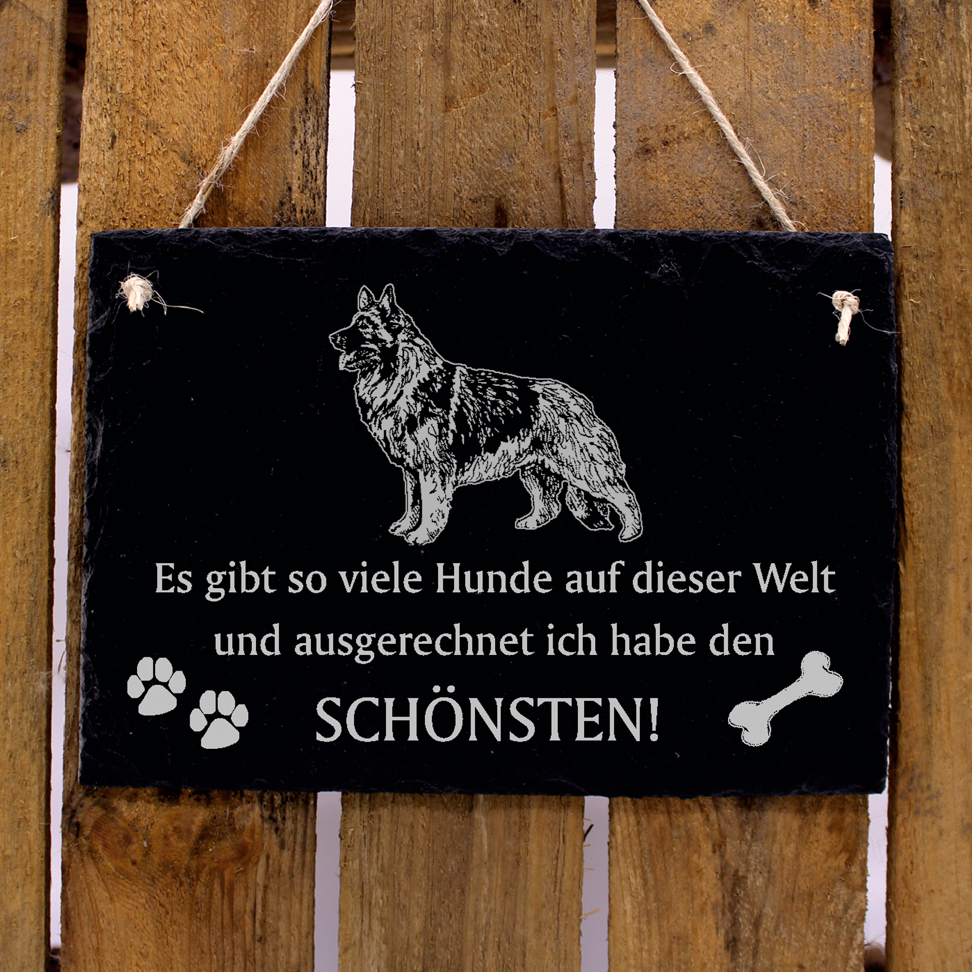 Shiloh Shepherd Besitzer aufgepasst! Mit unserem Hundeschild Shiloh Shepherd Schild zaubern Sie mit Sicherheit jedem Gast ein Lächeln ins Gesicht und zeitgleich warnen Sie jeden Besucher vor Ihrem Liebling. Der lustige Spruch Es gibt so viele Hunde auf dieser Welt und ausgerechnet ich habe den SCHÖNSTEN - vertreibt jede schlechte Stimmung und löst bei jedem Betrachter Emotionen aus. So wie Ihr Shiloh Shepherd bei Ihnen! Unser Hundeschild Shiloh Shepherd hinterlässt als persönliches Geschenk zum Geburtstag, zu Weihnachten, Nikolaus, Ostern und anderen Feiertagen bei jedem Shiloh Shepherd -Besitzer stets einen persönlichen, sowie bleibenden Eindruck. Machen Sie ihren Freunden eine Freude oder verschönern Sie ihr Zuhause. Diese liebevoll hergestellte und gestaltete Schiefertafel eignet sich als schöne Dekoration für jede Wohnung, jedes Haus und jedes Büro. Das perfekte Shiloh Shepherd Geschenk!