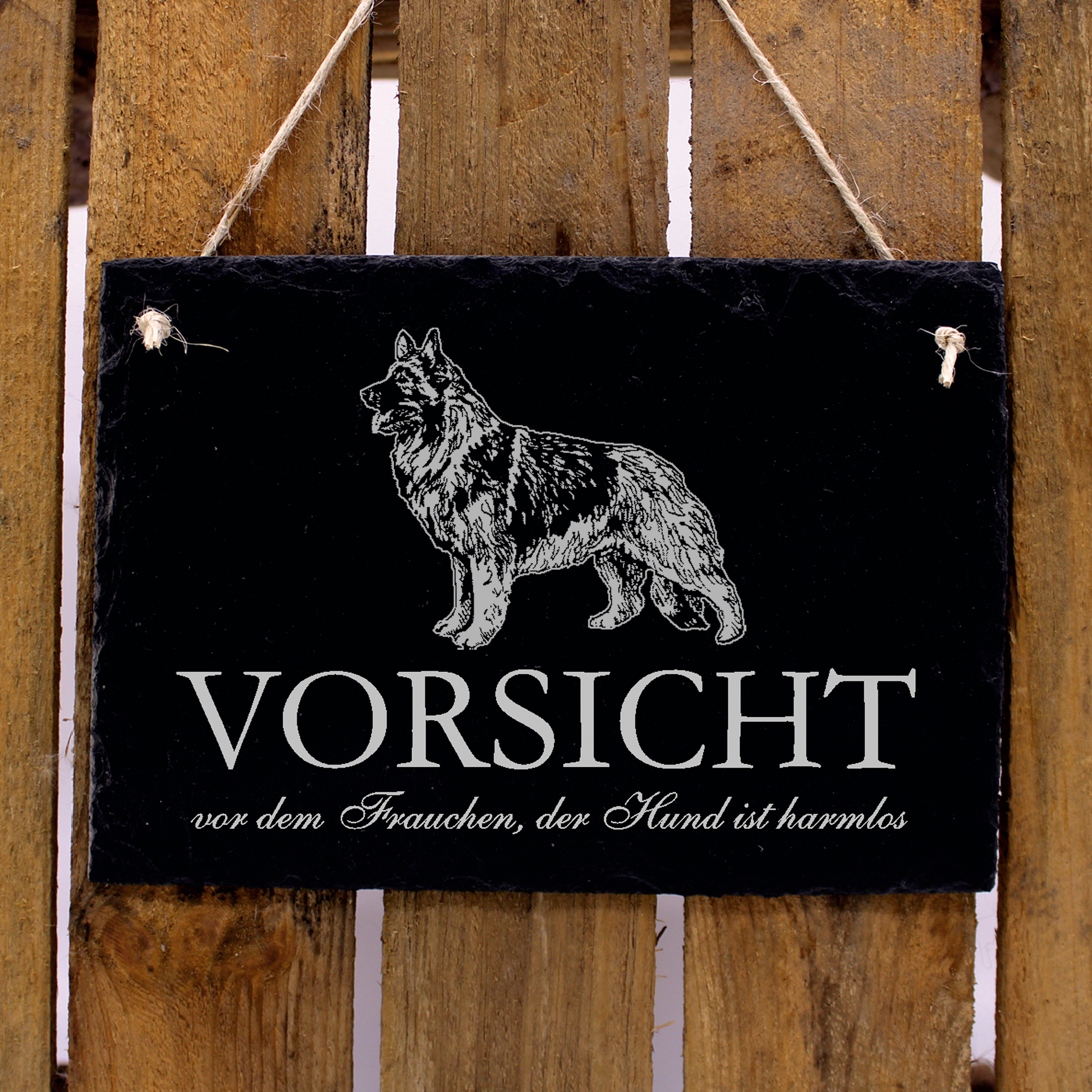 Shiloh Shepherd Besitzer aufgepasst! Mit unserem Hundeschild Shiloh Shepherd Schild zaubern Sie mit Sicherheit jedem Gast ein Lächeln ins Gesicht und zeitgleich warnen Sie jeden Besucher vor Ihrem Liebling. Der lustige Spruch - Vorsicht vor dem Frauchen, der Hund ist harmlos - vertreibt jede schlechte Stimmung und löst bei jedem Betrachter Emotionen aus. So wie Ihr Shiloh Shepherd bei Ihnen! Unser Hundeschild Shiloh Shepherd hinterlässt als persönliches Geschenk zum Geburtstag, zu Weihnachten, Nikolaus, Ostern und anderen Feiertagen bei jedem Shiloh Shepherd-Besitzer stets einen persönlichen, sowie bleibenden Eindruck. Machen Sie ihren Freunden eine Freude oder verschönern Sie ihr Zuhause. Diese liebevoll hergestellte und gestaltete Schiefertafel eignet sich als schöne Dekoration für jede Wohnung, jedes Haus und jedes Büro. Das perfekte Shiloh Shepherd Geschenk!